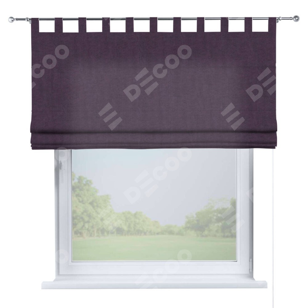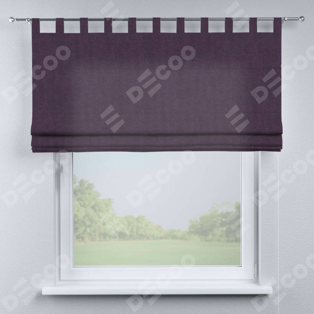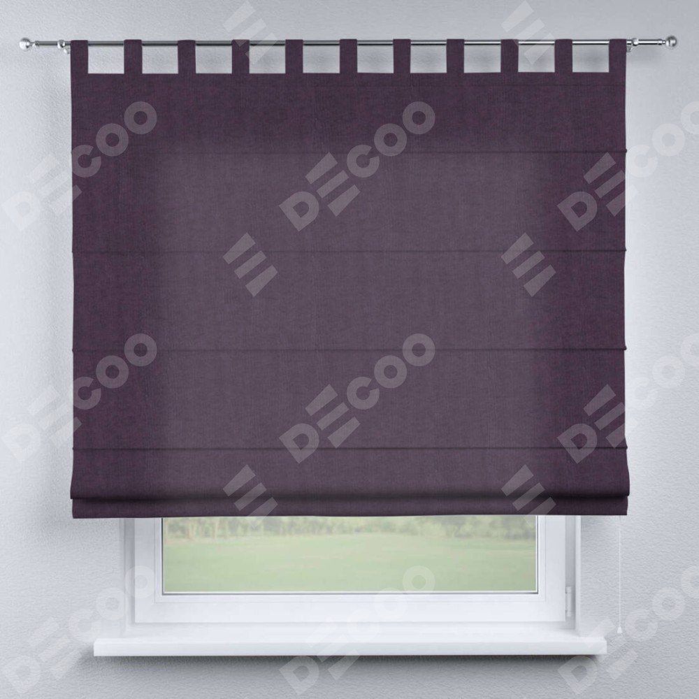 Римская штора производителя «Cortin», используется для проёма, пошита из ткани канвас баклажановый, артикул ткани v-111. Данная модель пошита на петлях, комплектуется на выбор круглым карнизом и подходит для монтажа на стену. Римская штора на петлях имеет простую систему регулировки высоты, отличительным преимуществом данной модели является простой способ монтажа. Достаточно повесить ее на трубу и штора готова!