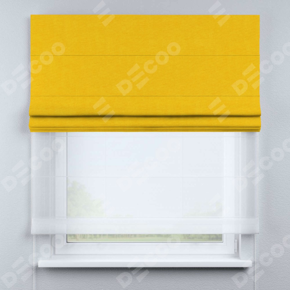 Римская штора день-ночь производителя «Cortin», используется для проёма, пошита из двух полотен, с лицевой стороны канвас желтый артикул v-344, вторая ткань тюль (по стандарту комплектуется тюль белого цвета артикул V-01). Имеет универсальный механизм и подходит для монтажа: на потолок, на стену и в нишу.