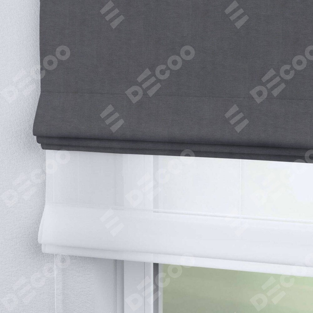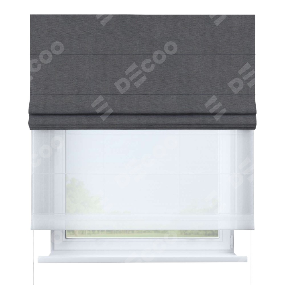 Римская штора день-ночь производителя «Cortin», используется для проёма, пошита из двух полотен, с лицевой стороны канвас мокрый асфальт артикул v-1083, вторая ткань тюль (по стандарту комплектуется тюль белого цвета артикул V-01). Имеет универсальный механизм и подходит для монтажа: на потолок, на стену и в нишу.