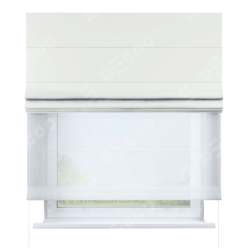 Римская штора день-ночь производителя «Cortin», используется для проёма, пошита из двух полотен, с лицевой стороны канвас молочный артикул v-93, вторая ткань тюль (по стандарту комплектуется тюль белого цвета артикул V-01). Имеет универсальный механизм и подходит для монтажа: на потолок, на стену и в нишу.