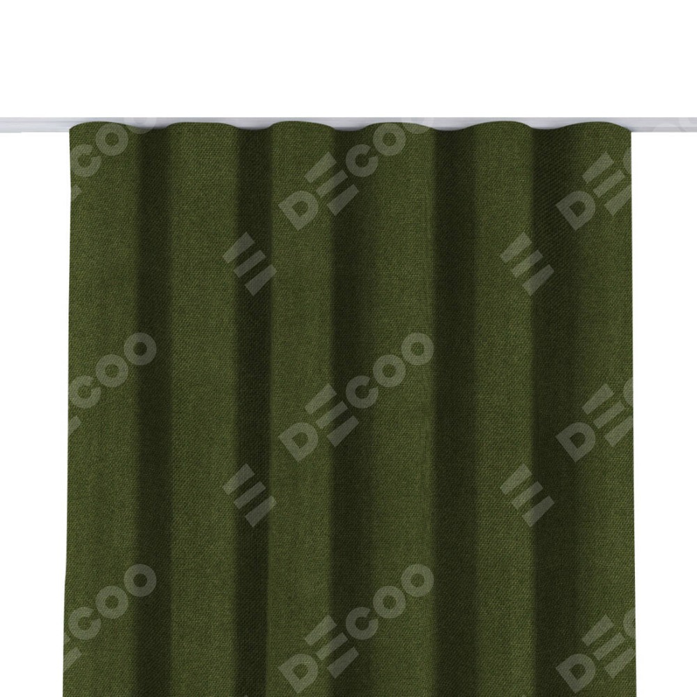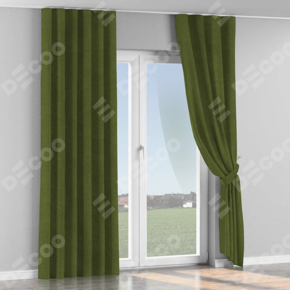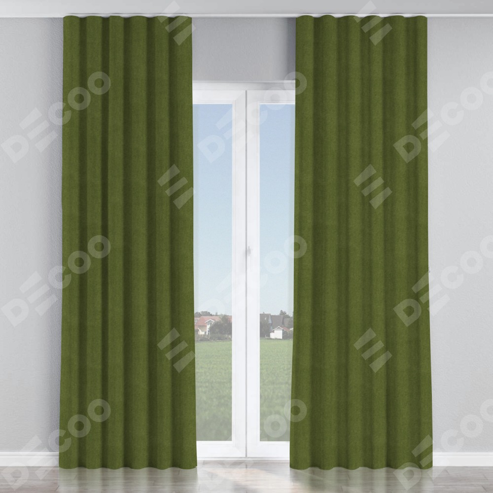 Комплект прямых штор, от производителя «Cortin», пошиты из ткани лён димаут салатовый, артикул ткани 91002. С изнаночной стороны в верхней части штор пристрачивается шторная лента с декоративными складками «Волна». Для создания элегантных складок прямые шторы шьются по стандарту с коэффициентом 1:2 (на 100 см. ширины проёма 200 см. ширины ткани).
