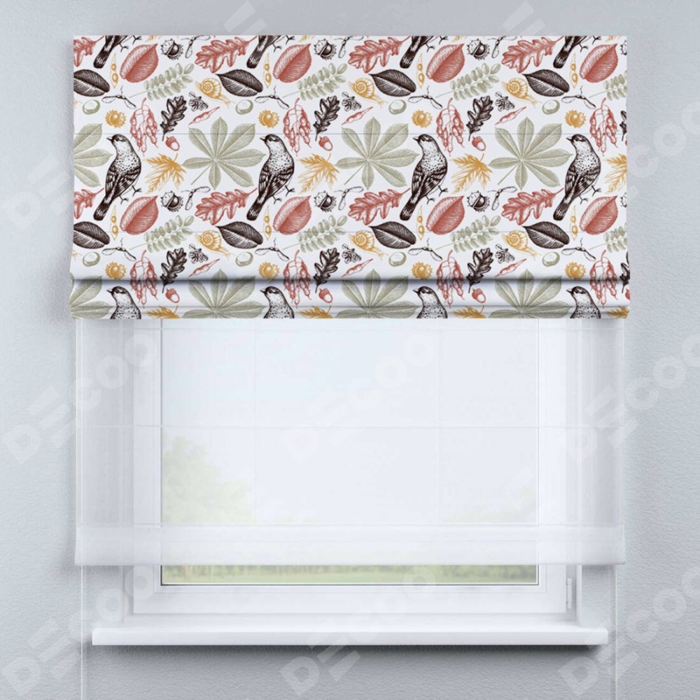 Римская штора день-ночь производителя «Cortin», используется для проёма, пошита из двух полотен, с лицевой блэкаут с нанесением сублимационной печати «Краски осени», вторая ткань тюль (по стандарту комплектуется тюль белого цвета артикул V-01). Имеет универсальный механизм и подходит для монтажа: на потолок, на стену и в нишу.