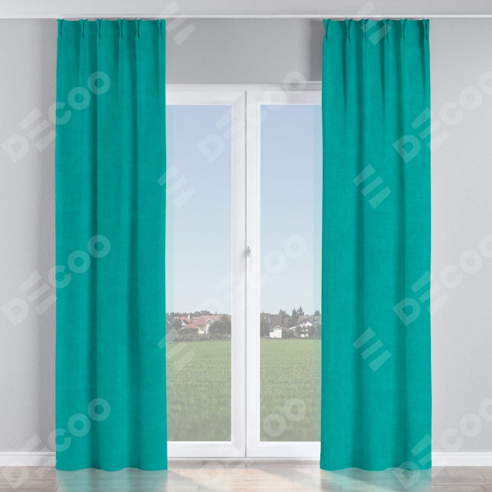Комплект прямых штор, от производителя «Cortin», пошиты из ткани канвас бирюзовый, артикул ткани v-1048. С изнаночной стороны в верхней части штор пристрачивается шторная лента с декоративными складками «Кустик». Для создания элегантных складок прямые шторы шьются по стандарту с коэффициентом 1:2 (на 100 см. ширины проёма 200 см. ширины ткани).