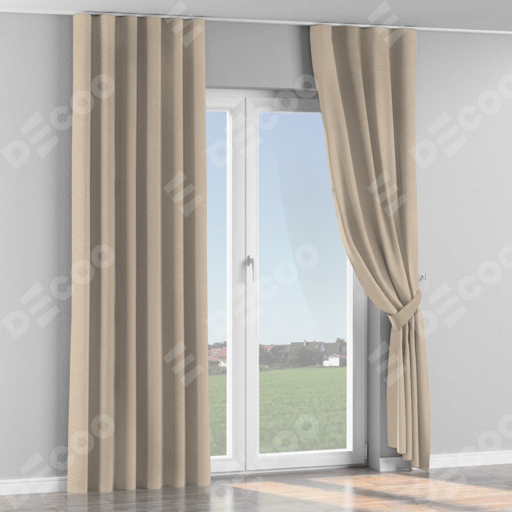 Комплект прямых штор, от производителя «Cortin», пошиты из ткани канвас кофе с молоком, артикул ткани v-07. С изнаночной стороны в верхней части штор пристрачивается шторная лента с декоративными складками «Волна». Для создания элегантных складок прямые шторы шьются по стандарту с коэффициентом 1:2 (на 100 см. ширины проёма 200 см. ширины ткани).