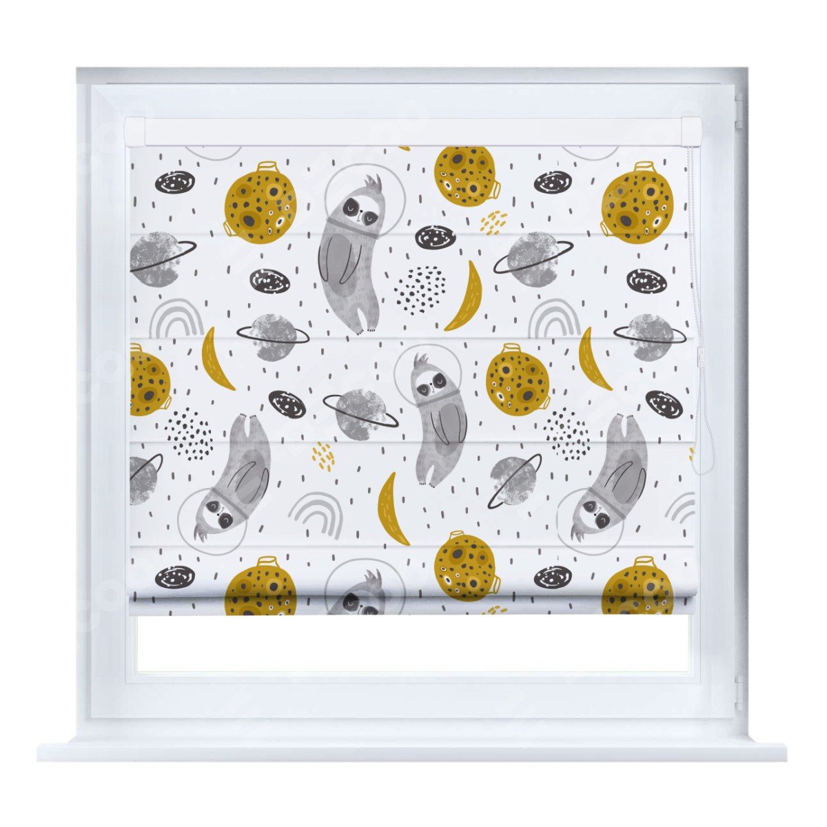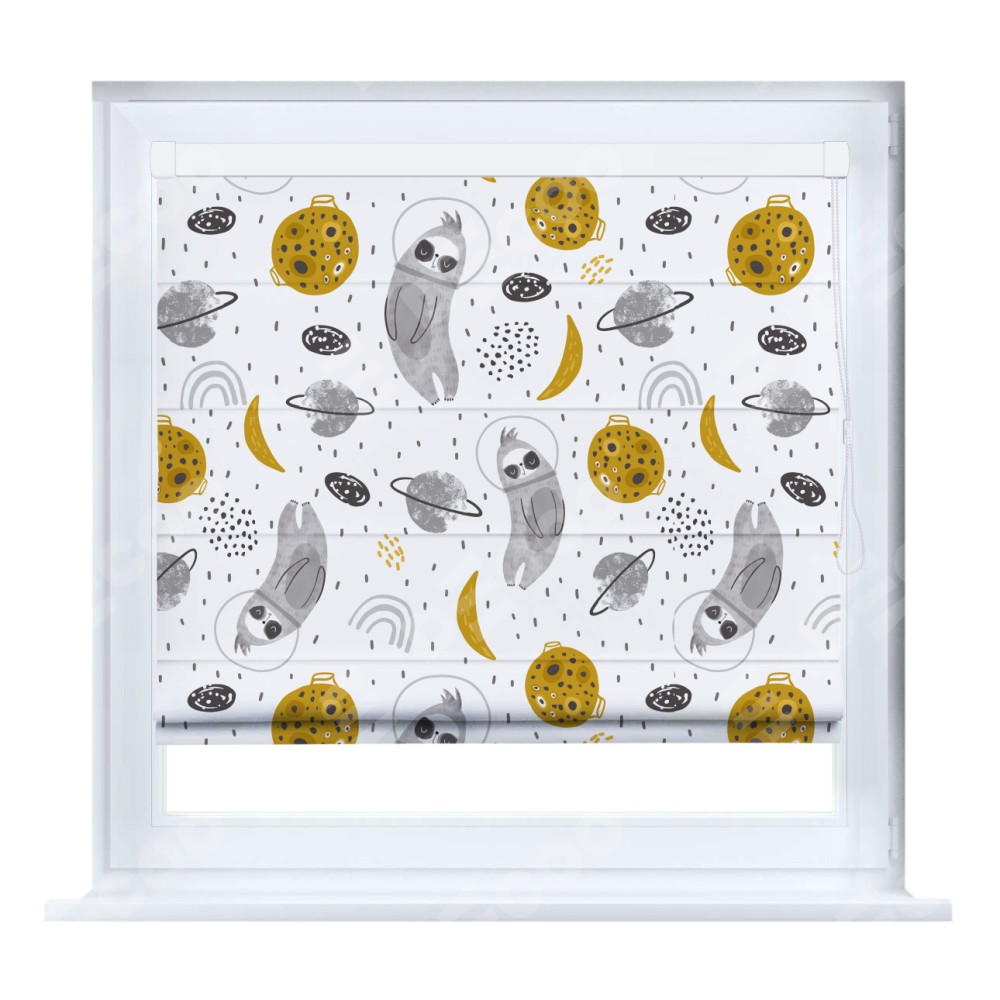 Римская штора кассетного типа, производителя «Cortin», устанавливается только на пластиковые окна и прилегает к стеклопакету, пошита из ткани блэкаут с нанесением сублимационной печати «Ленивец в шлеме».