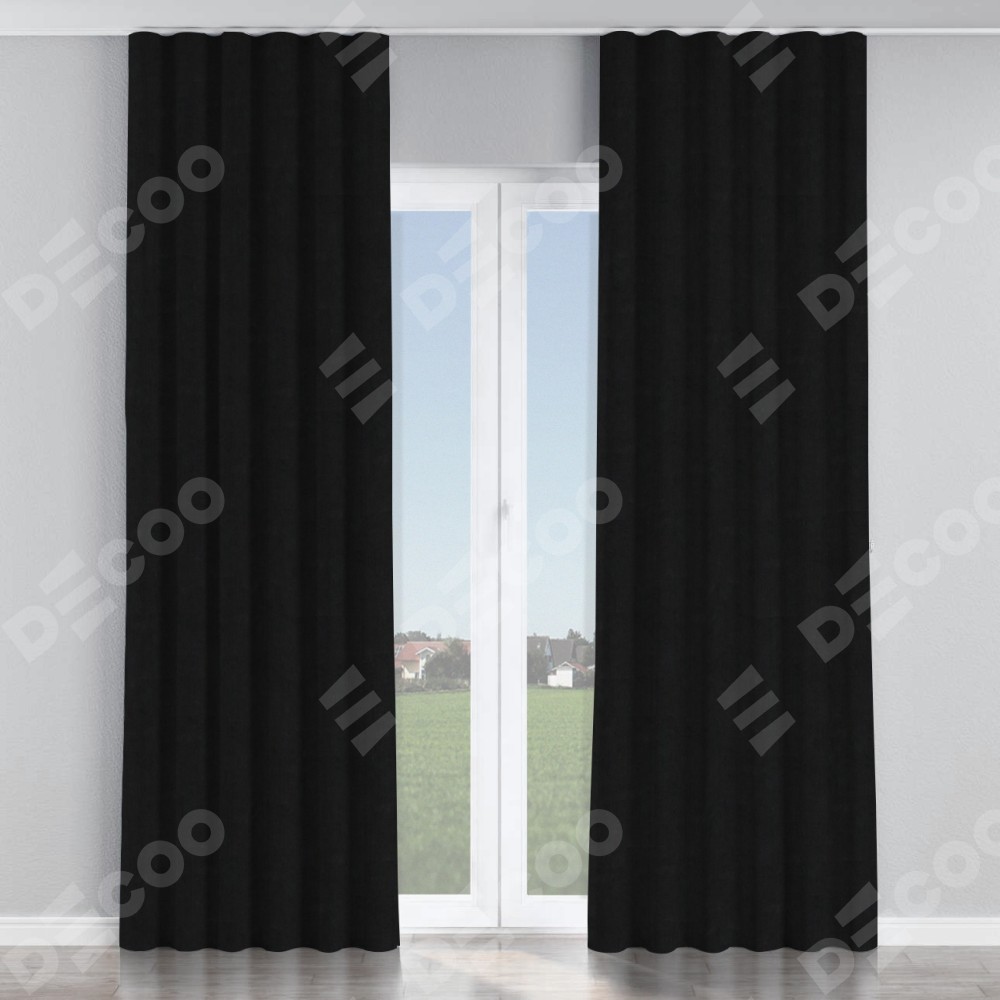 Комплект прямых штор, от производителя «Cortin», пошиты из ткани канвас черный, артикул ткани v-194. С изнаночной стороны в верхней части штор пристрачивается шторная лента с декоративными складками «Волна». Для создания элегантных складок прямые шторы шьются по стандарту с коэффициентом 1:2 (на 100 см. ширины проёма 200 см. ширины ткани).