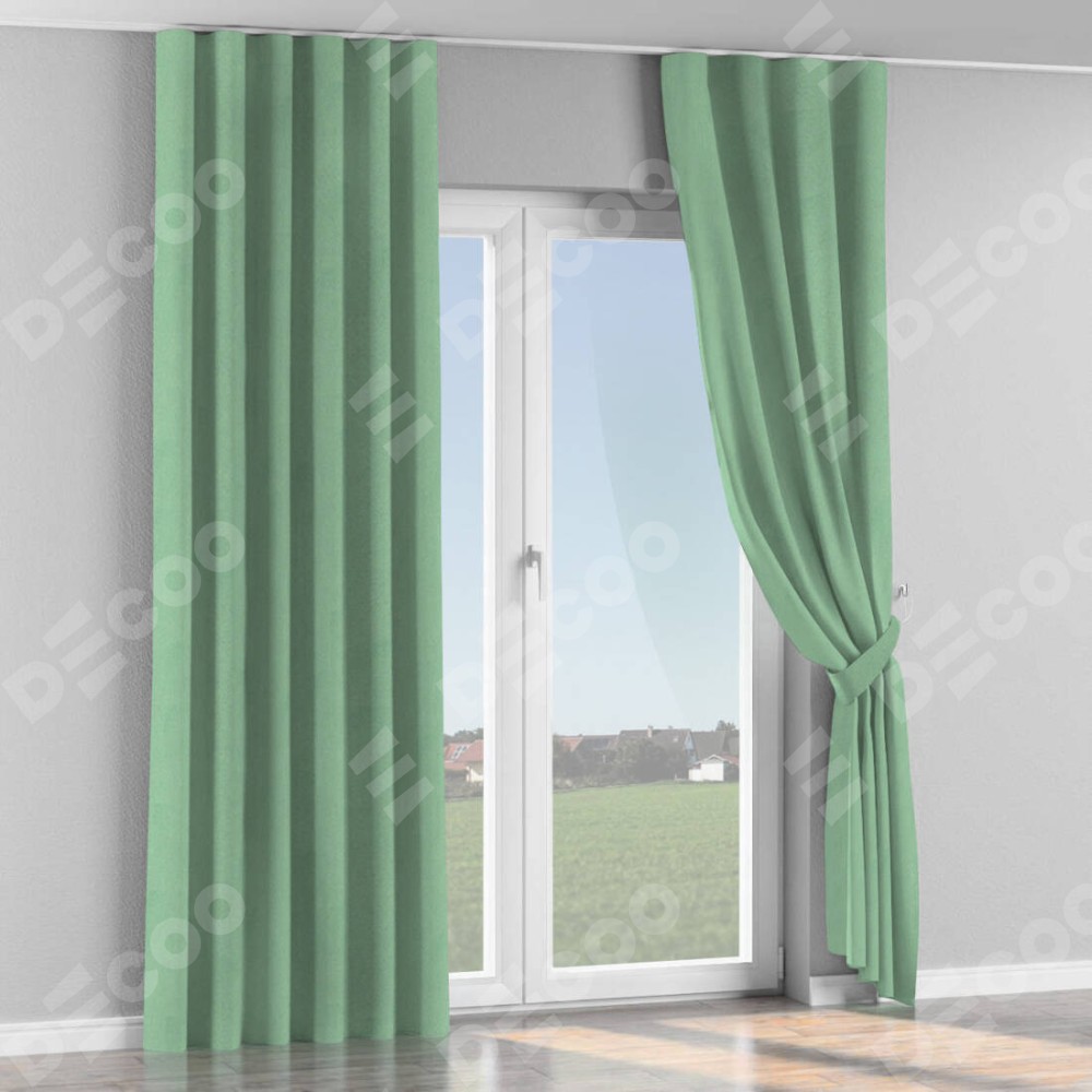 Комплект прямых штор, от производителя «Cortin», пошиты из ткани блэкаут однотонный ментоловый, артикул ткани 91572−1. С изнаночной стороны в верхней части штор пристрачивается шторная лента с декоративными складками «Волна». Для создания элегантных складок прямые шторы шьются по стандарту с коэффициентом 1:2 (на 100 см. ширины проёма 200 см. ширины ткани).