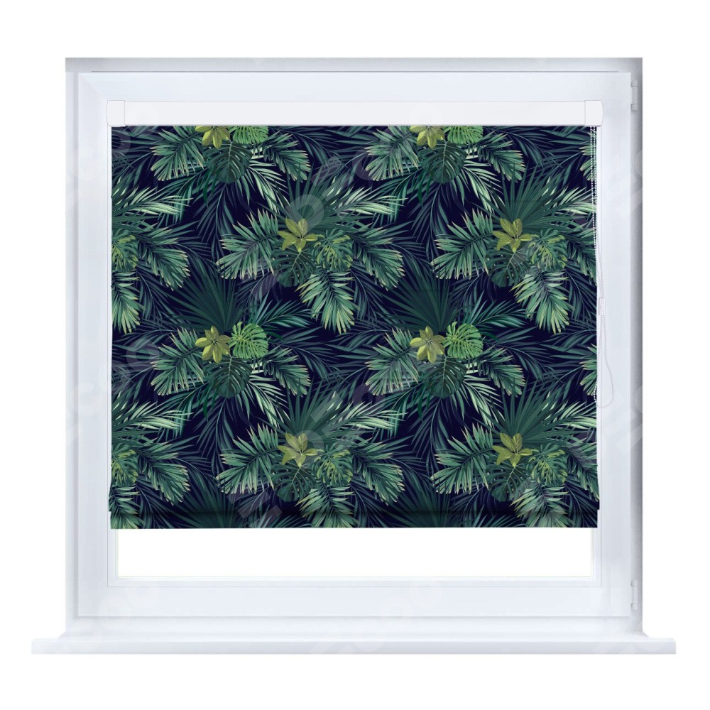 Римская штора производителя «Cortin», устанавливается на створку окна, пошита из ткани блэкаут с нанесением сублимационной печати «Пальмовые листья». Штора шьётся по индивидуальным размерам, для данного типа римской шторы возможная ширина от 35 до 150 см., высота до 250 см.