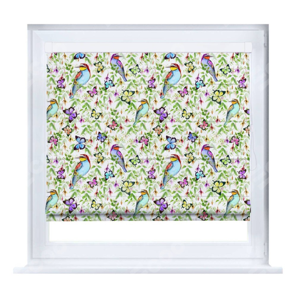 Римская штора производителя «Cortin», устанавливается на створку окна, пошита из ткани блэкаут с нанесением сублимационной печати «Тропические птицы». Штора шьётся по индивидуальным размерам, для данного типа римской шторы возможная ширина от 35 до 150 см., высота до 250 см.
