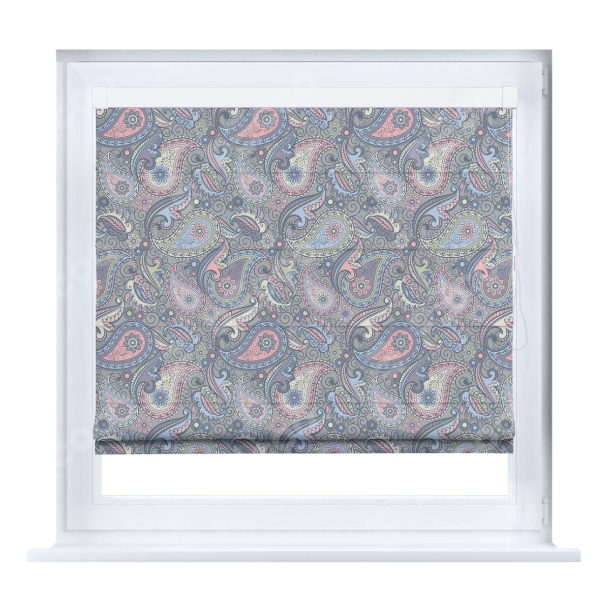 Римская штора кассетного типа, производителя «Cortin», устанавливается только на пластиковые окна и прилегает к стеклопакету, пошита из ткани блэкаут с нанесением сублимационной печати «Цветной пейсли».