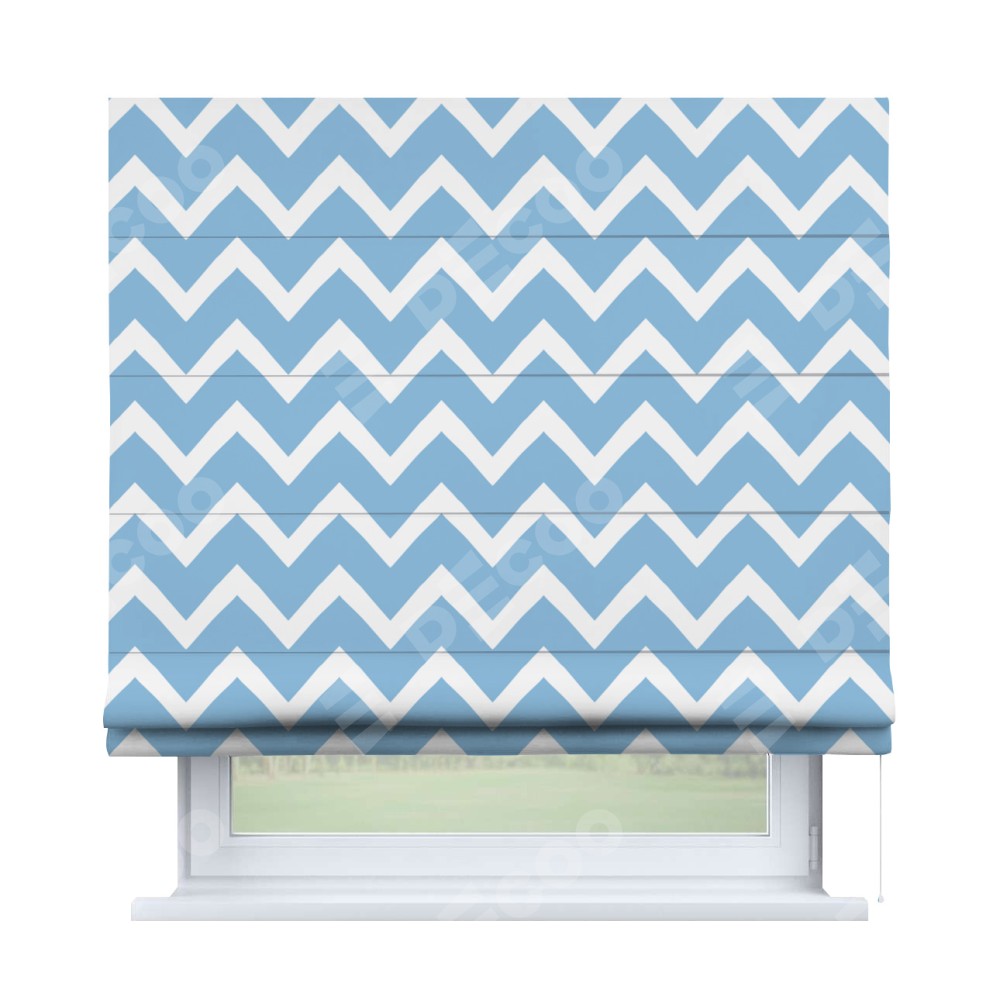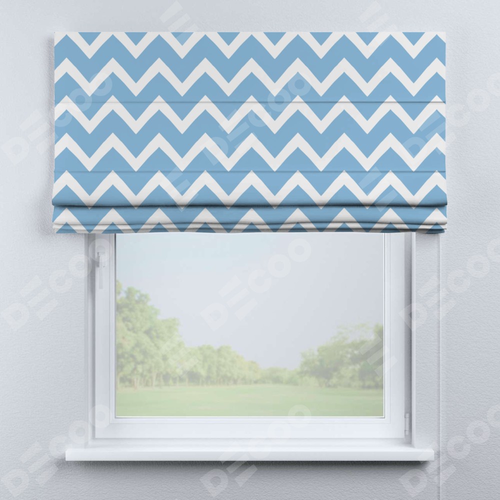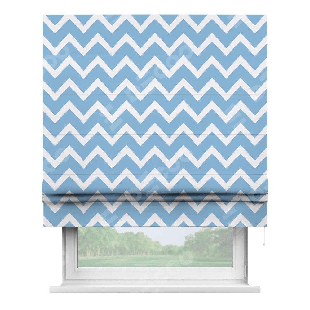 Римская штора производителя «Cortin», используется для проёма, пошита из ткани блэкаут с нанесением сублимационной печати «Зигзаг средний». Имеет универсальный механизм и подходит для монтажа: на потолок, на стену и в нишу.