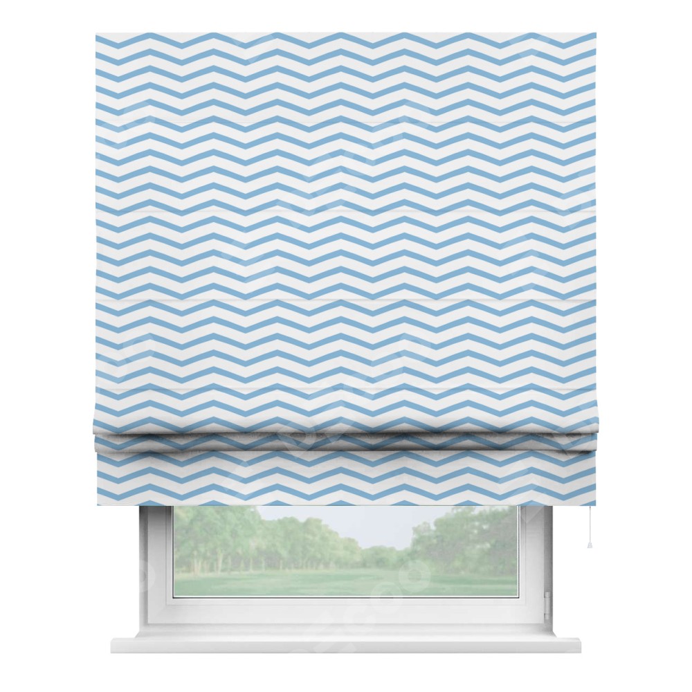 Римская штора производителя «Cortin», используется для проёма, пошита из ткани блэкаут с нанесением сублимационной печати «Зигзаг мелкий». Имеет универсальный механизм и подходит для монтажа: на потолок, на стену и в нишу.
