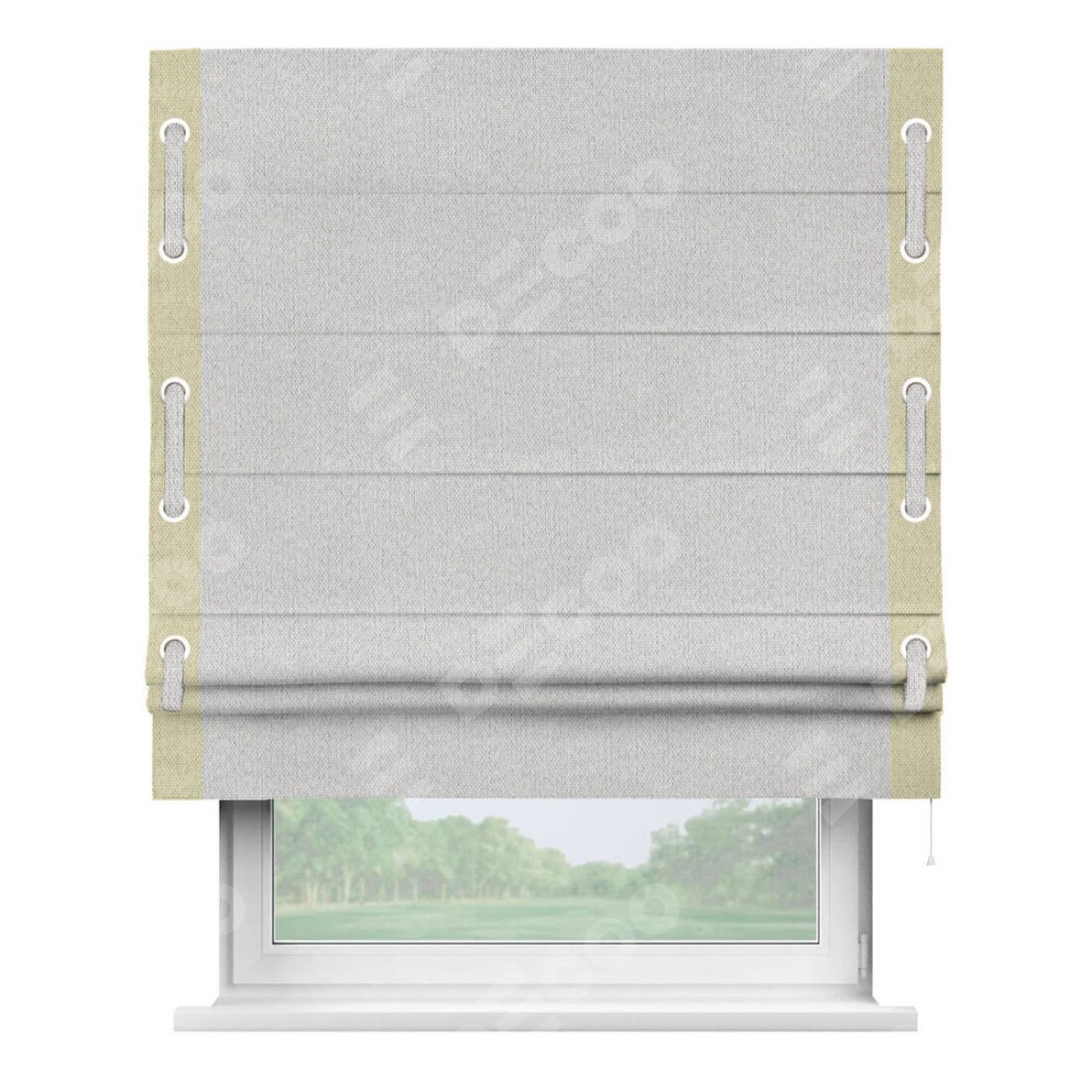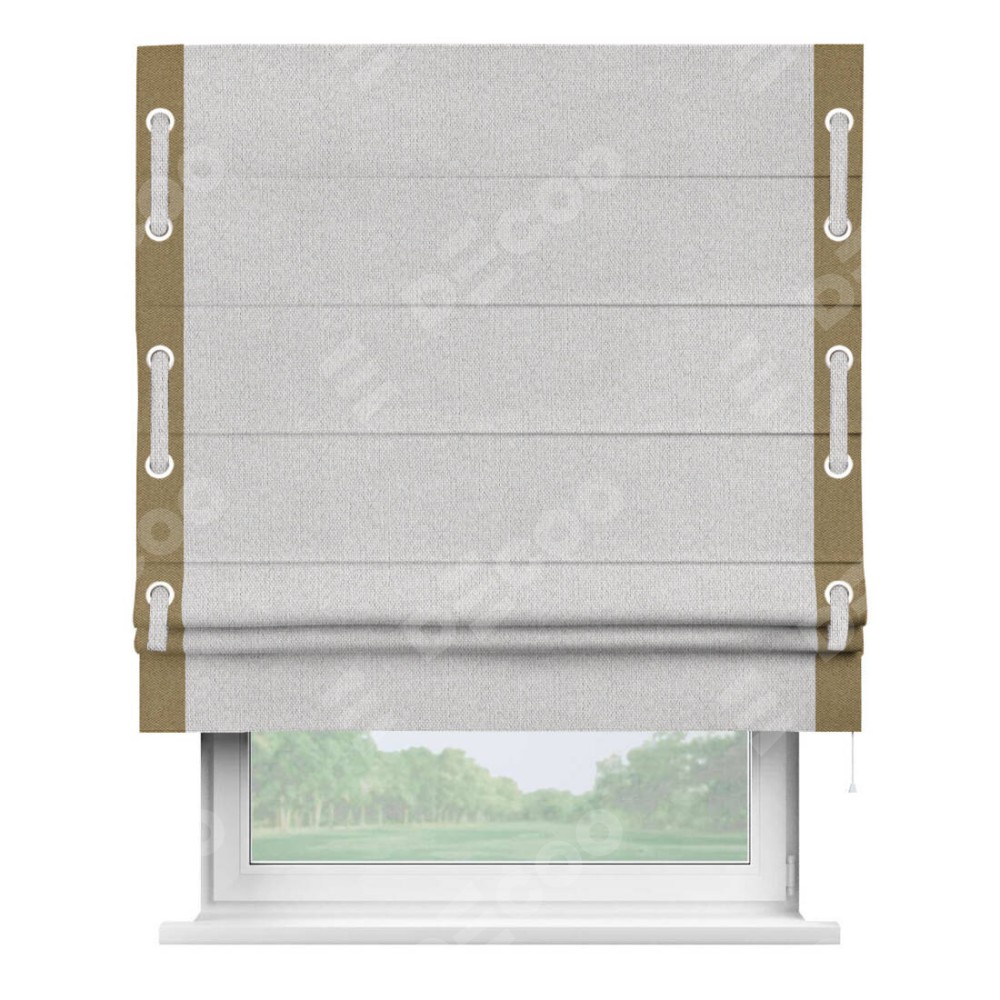 Римская штора производителя «Cortin», используется для проёма, пошита из ткани лён димаут светло-бежевый, артикул 90993. Отделка шторы кантом «Стрим Дуо» на кантах расположены люверсы с пояском, ткань для канта используется лён димаут разной расцветки на выбор. Ткань для пояска обычно используется из основной ткани шторы, а так же можно сделать из любой расцветки по желанию. Имеет универсальный механизм и подходит для монтажа: на потолок, на стену и в нишу.
