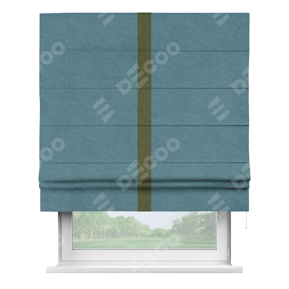 Римская штора производителя «Cortin», используется для проёма, пошита из ткани лён димаут светло-синий, артикул 91007. Отделка шторы кантом «Хайвэй», ткань для канта используется из льна димаут разной расцветки на выбор. Имеет универсальный механизм и подходит для монтажа: на потолок, на стену и в нишу.