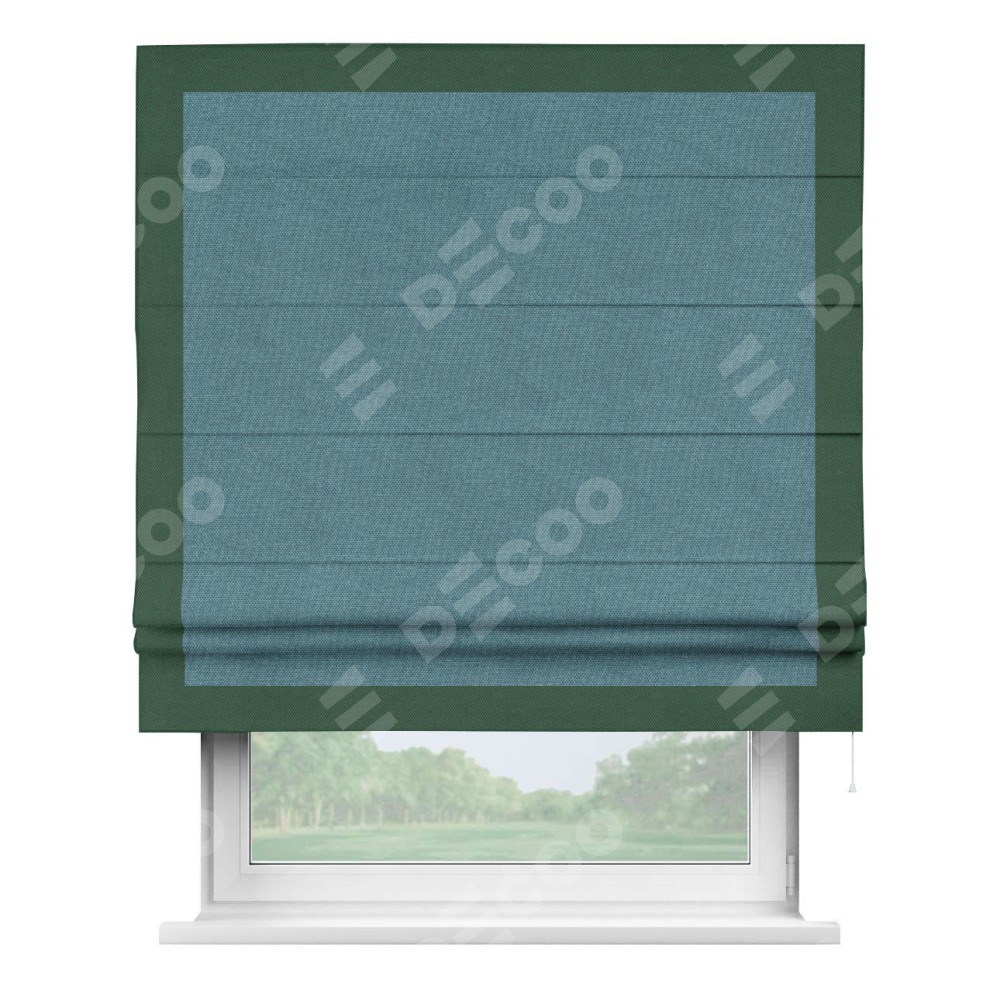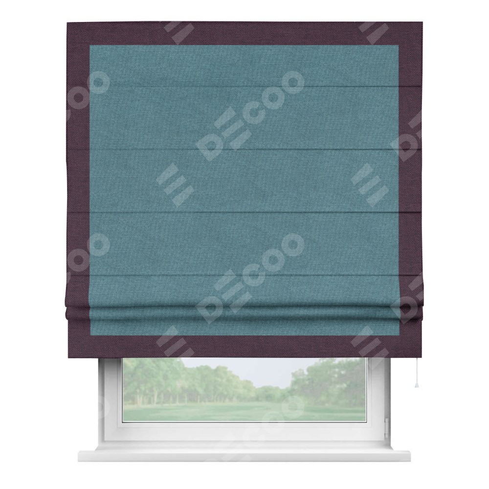 Римская штора производителя «Cortin», используется для проёма, пошита из ткани лён димаут светло-синий, артикул 91007. Отделка шторы кантом «Чесс», ткань для канта используется из льна димаут разной расцветки на выбор. Имеет универсальный механизм и подходит для монтажа: на потолок, на стену и в нишу.