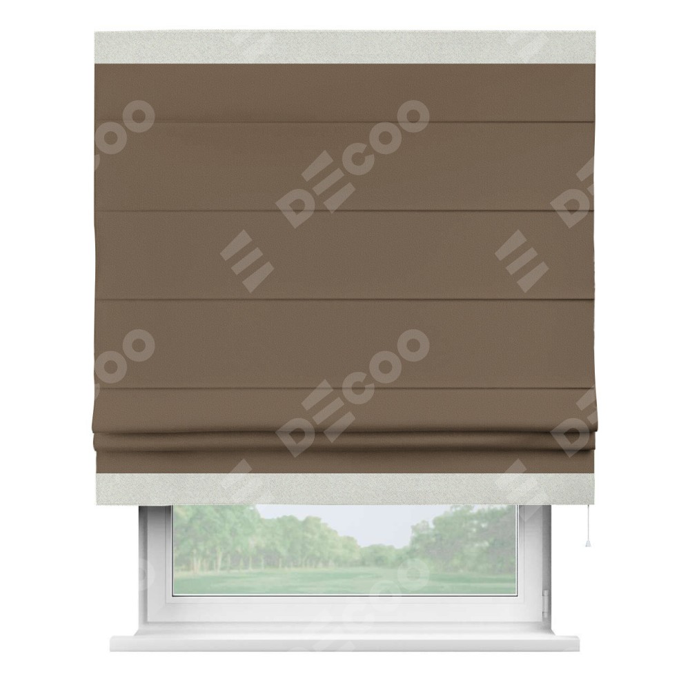 Римская штора производителя «Cortin», используется для проёма, пошита из ткани блэкаут однотонный коричневый, артикул ткани 91334. Отделка шторы кантом «Горизонт», ткань для канта используется из блэкаута однотонного разной расцветки на выбор. Имеет универсальный механизм и подходит для монтажа: на потолок, на стену и в нишу.