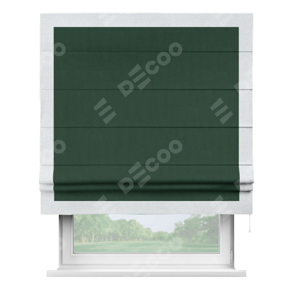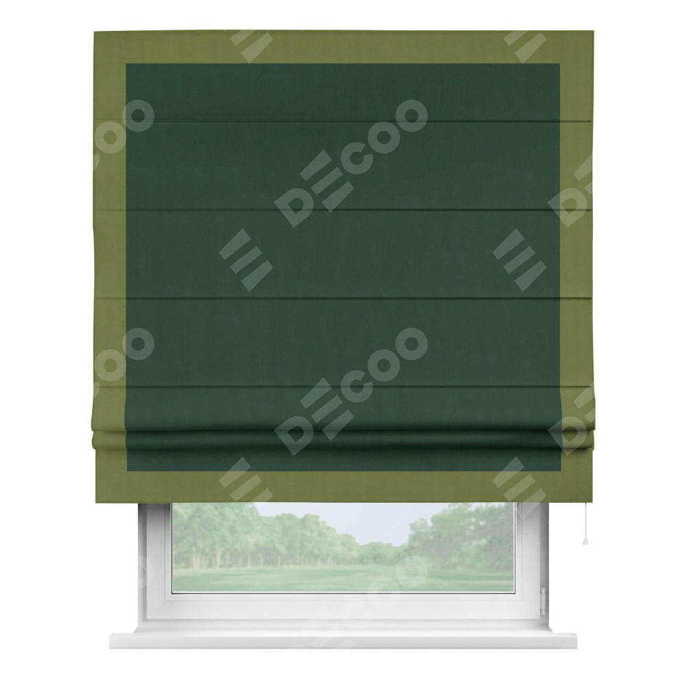 Римская штора производителя «Cortin», используется для проёма, пошита из ткани блэкаут однотонный зелёный, артикул ткани 91572−2. Отделка шторы кантом «Чесс», ткань для канта используется из блэкаута однотонного разной расцветки на выбор. Имеет универсальный механизм и подходит для монтажа: на потолок, на стену и в нишу.
