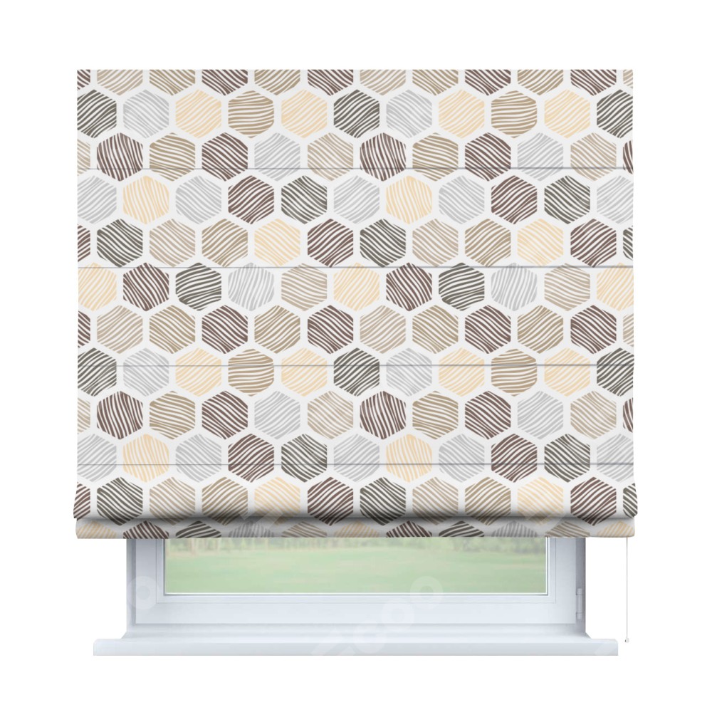 Классическая римская штора производителя «Cortin», пошита из ткани блэкаут с нанесением сублимационной печати «Мозаика соты». Имеет универсальный механизм и подходит для монтажа: на потолок, на стену и в нишу.