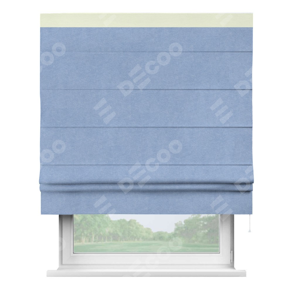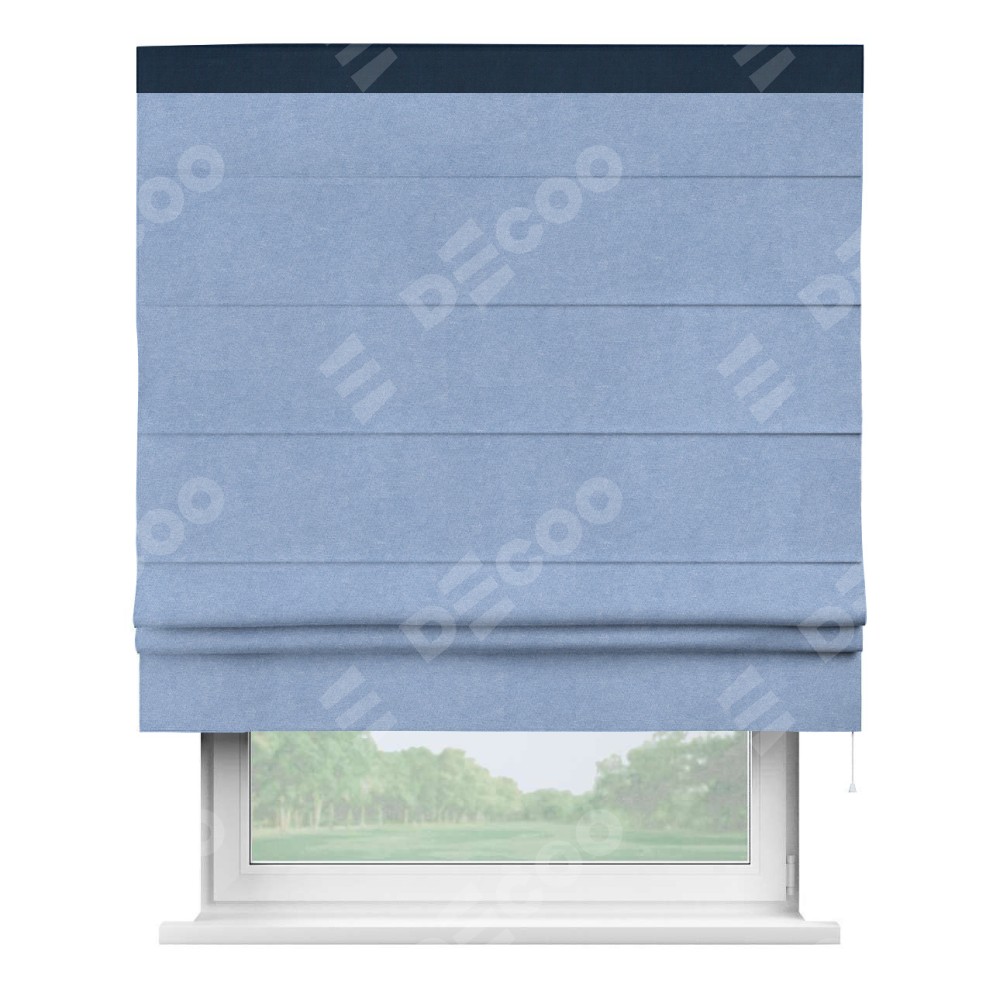 Римская штора производителя «Cortin», используется для проёма, пошита из ткани вельвет васильковый, артикул ткани 33799. Отделка шторы кантом «Кинг», ткань для канта используется из вельвета разной расцветки на выбор. Имеет универсальный механизм и подходит для монтажа: на потолок, на стену и в нишу.