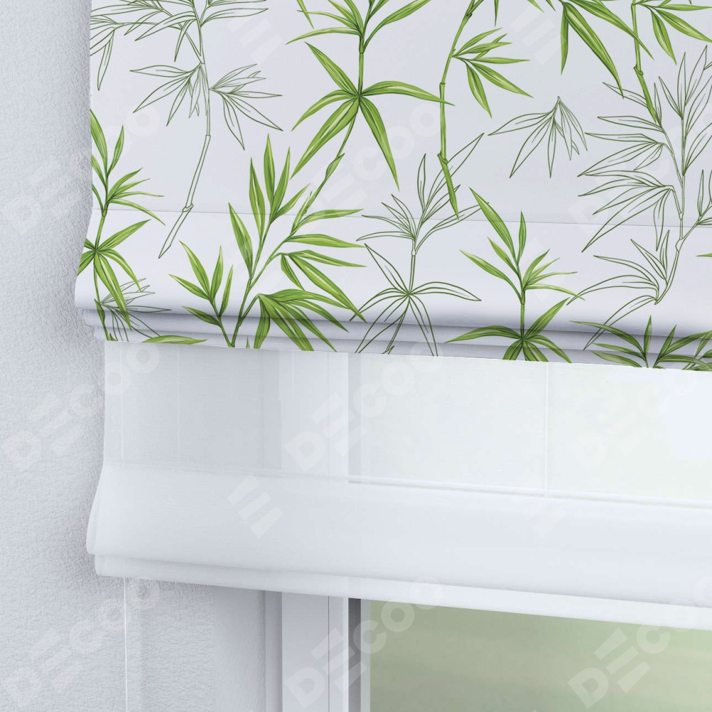 Двойная римская штора «День-ночь» от производителя Cortin предназначена для использования в проёмах. Эта штора уникальна тем, что состоит из двух полотен. На лицевой стороне находится блэкаут с нанесением сублимационной печати «Зелёный бамбук», обеспечивающий эффективное затемнение. В комплект также входит вторая ткань — легкий белый тюль (артикул: V-01), который добавляет изящества и легкости оформлению окна. Кроме того, доступны и другие разновидности ткани тюль, выбор которых доступен по  ссылке .