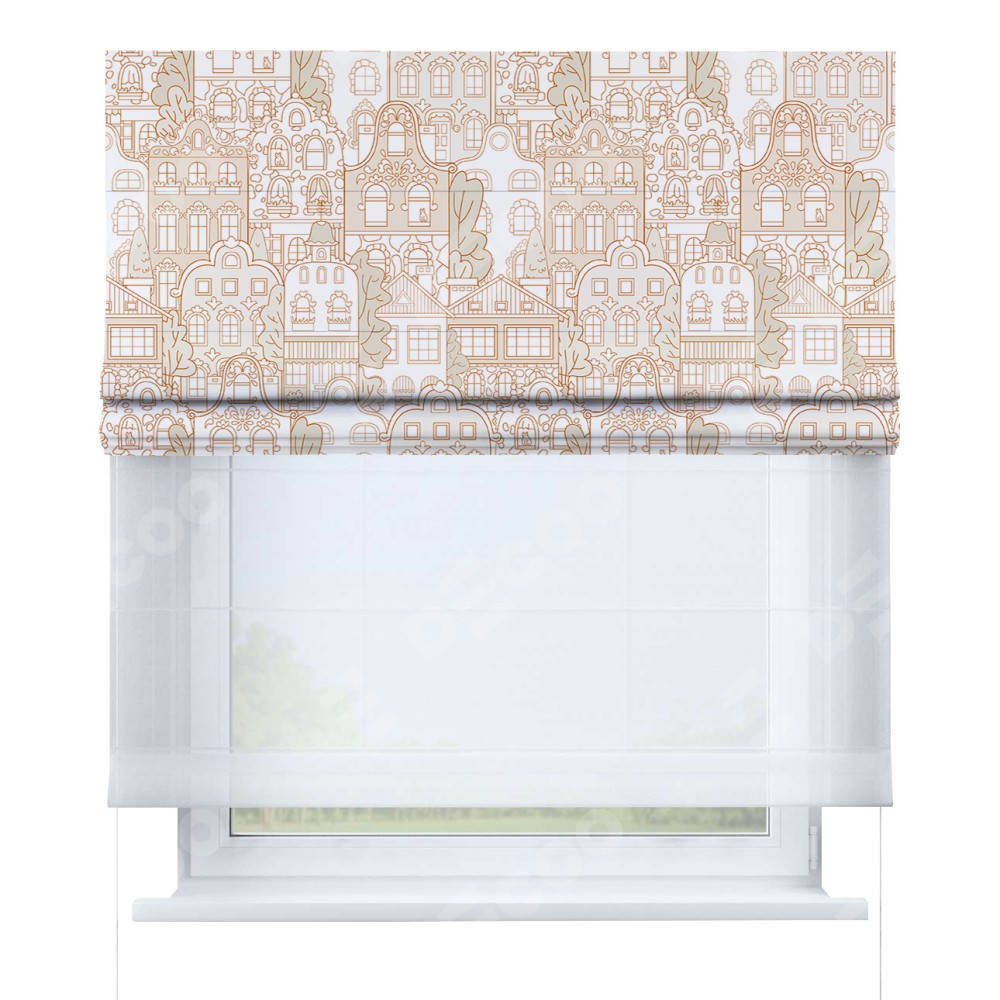 Двойная римская штора «День-ночь» от производителя Cortin предназначена для использования в проёмах. Эта штора уникальна тем, что состоит из двух полотен. На лицевой стороне находится блэкаут с нанесением сублимационной печати «Милый городок», обеспечивающий эффективное затемнение. В комплект также входит вторая ткань — легкий белый тюль (артикул: V-01), который добавляет изящества и легкости оформлению окна. Кроме того, доступны и другие разновидности ткани тюль, выбор которых доступен по ссылке .