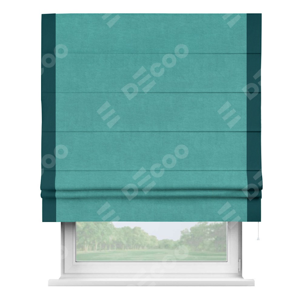 Римская штора производителя «Cortin», используется для проёма, пошита из ткани канвас бирюзовый, артикул ткани v-1048. Отделка шторы кантом «Стрим Дуо» (изумрудный v-12487), ткань для канта используется из канваса разной расцветки на выбор. Имеет универсальный механизм и подходит для монтажа: на потолок, на стену и в нишу.