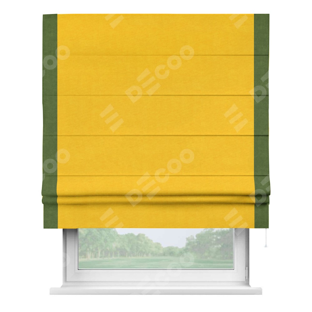 Римская штора производителя «Cortin», используется для проёма, пошита из ткани канвас желтый, артикул ткани v-344. Отделка шторы кантом «Стрим Дуо» (трава v-473), ткань для канта используется из канваса разной расцветки на выбор. Имеет универсальный механизм и подходит для монтажа: на потолок, на стену и в нишу.
