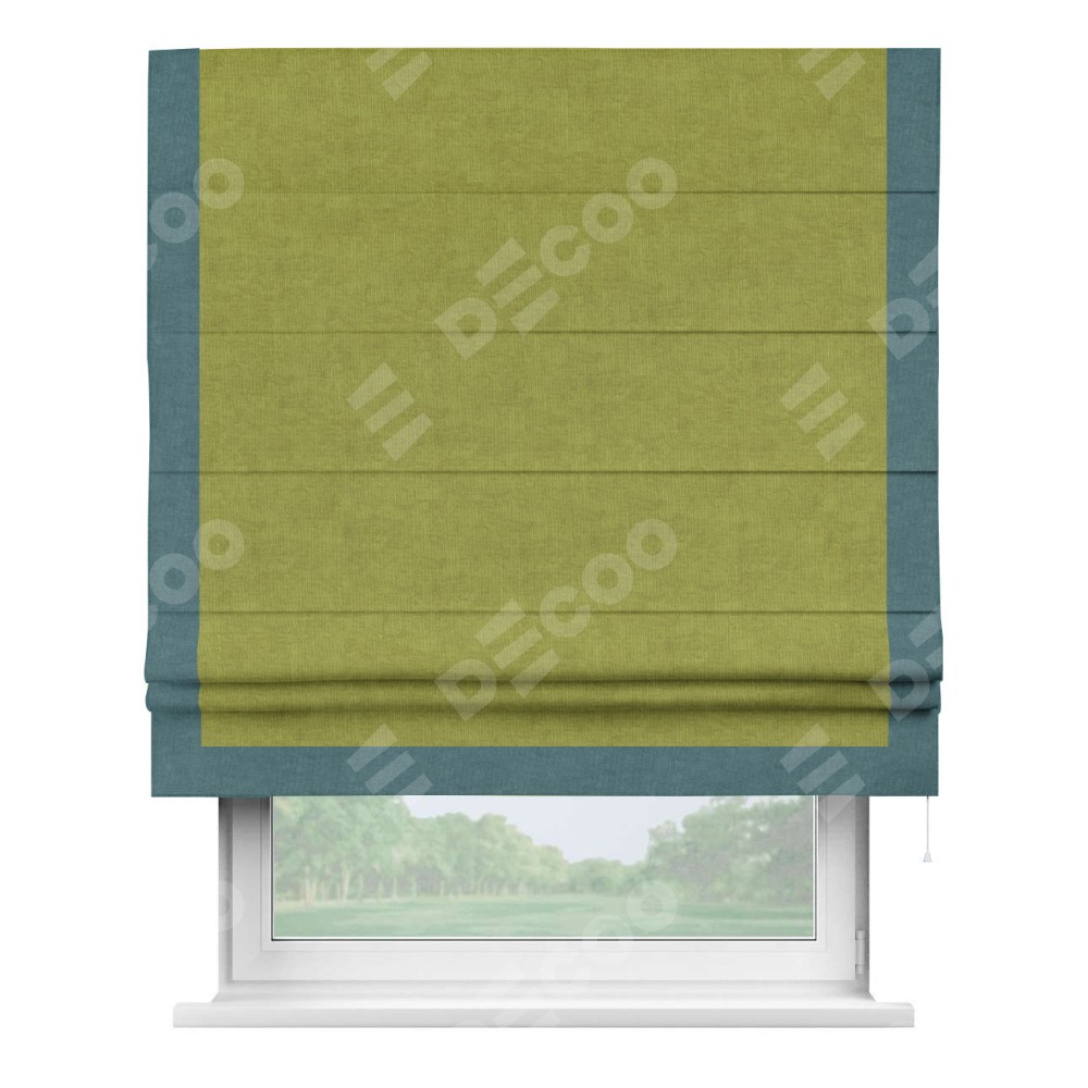 Римская штора производителя «Cortin», используется для проёма, пошита из ткани канвас зелёное яблоко, артикул ткани v-370. Отделка шторы кантом «Виктория» (ментоловый v-114), ткань для канта используется из канваса разной расцветки на выбор. Имеет универсальный механизм и подходит для монтажа: на потолок, на стену и в нишу.