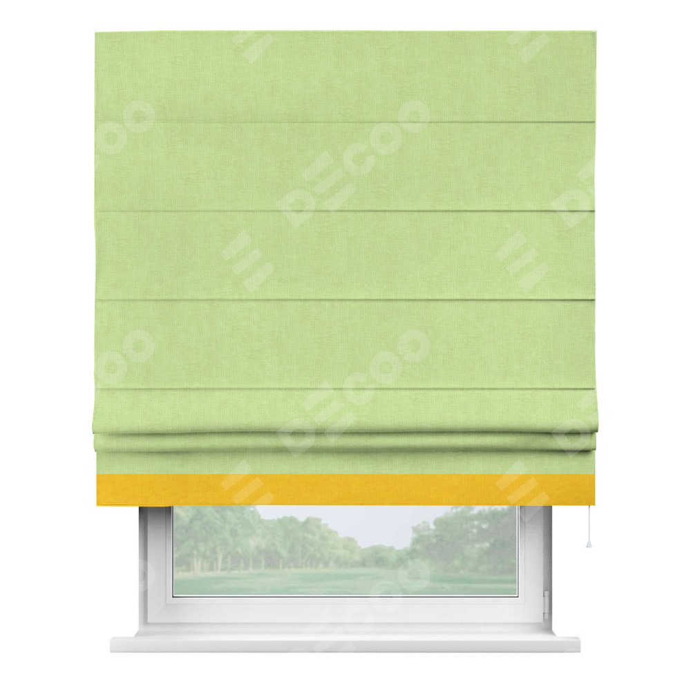 Римская штора производителя «Cortin», используется для проёма, пошита из ткани канвас липовый, артикул ткани v-207. Отделка шторы кантом «Джестер» (желтый v-344), ткань для канта используется из канваса разной расцветки на выбор. Имеет универсальный механизм и подходит для монтажа: на потолок, на стену и в нишу.