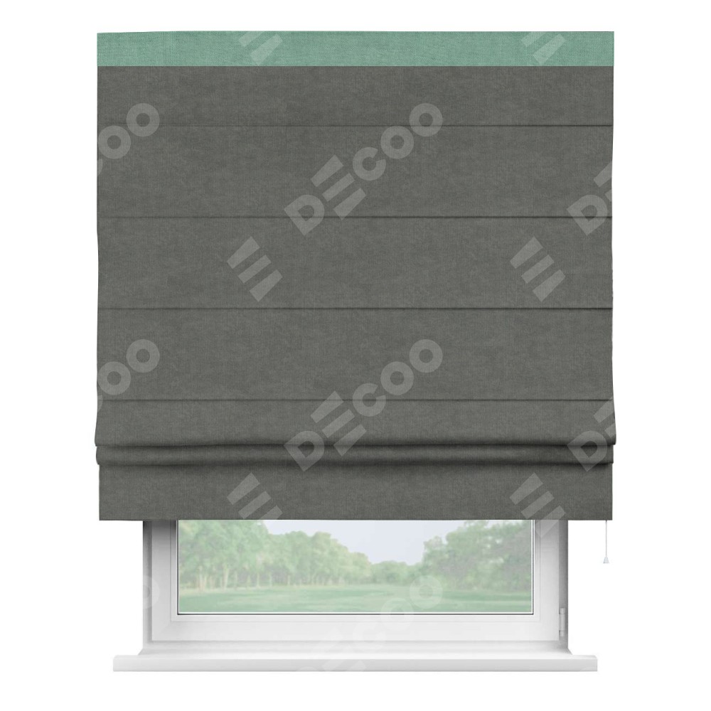 Римская штора производителя «Cortin», используется для проёма, пошита из ткани канвас тёмно-серый, артикул ткани v-340. Отделка шторы кантом «Кинг» (мятный v-248), ткань для канта используется из канваса разной расцветки на выбор. Имеет универсальный механизм и подходит для монтажа: на потолок, на стену и в нишу.