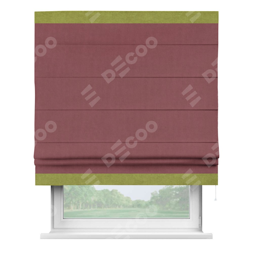 Римская штора производителя «Cortin», используется для проёма, пошита из ткани канвас ягодный, артикул ткани v-28. Отделка шторы кантом «Горизонт» (зелёное яблоко v-370), ткань для канта используется из канваса разной расцветки на выбор. Имеет универсальный механизм и подходит для монтажа: на потолок, на стену и в нишу.