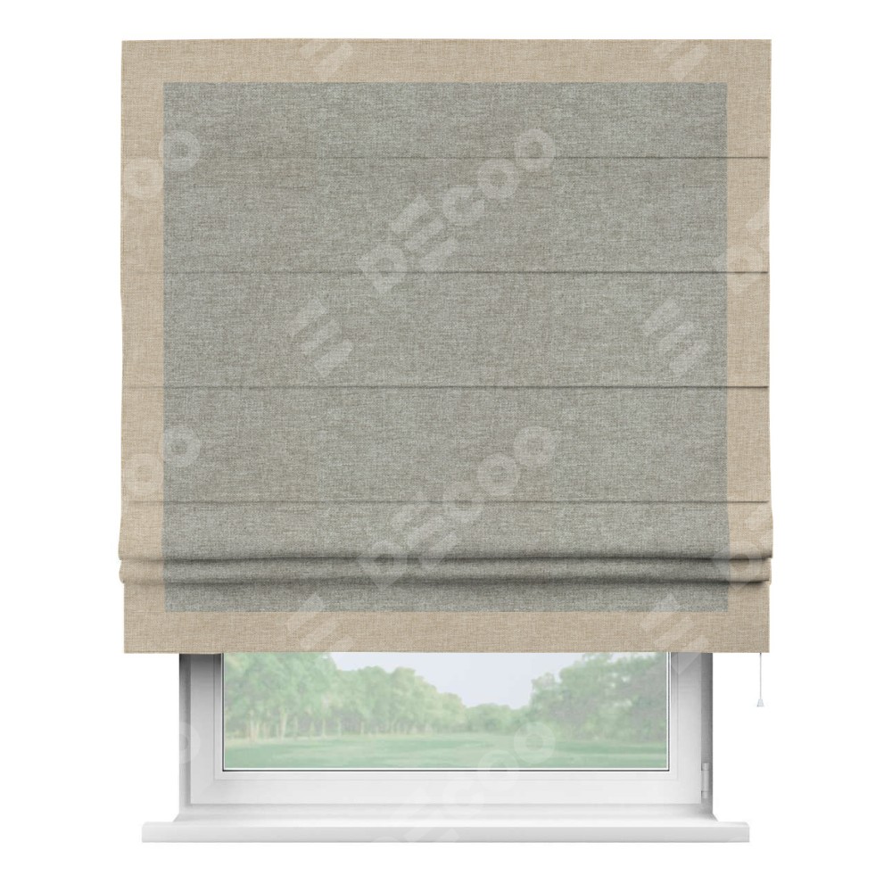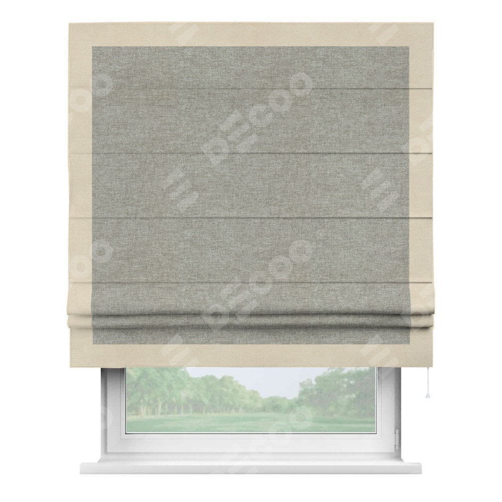 Римская штора производителя «Cortin», используется для проёма, пошита из ткани лён кашемир серый, артикул 17208. Отделка шторы кантом «Чесс», ткань для канта используется из льна разной расцветки на выбор. Имеет универсальный механизм и подходит для монтажа: на потолок, на стену и в нишу.