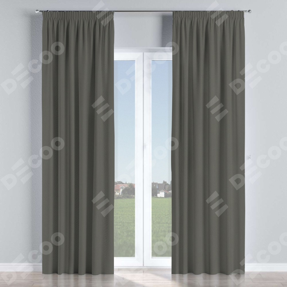 Комплект прямых штор, от производителя «Cortin», пошиты из ткани блэкаут однотонный тёмно-серый, артикул ткани 91570. С изнаночной стороны в верхней части штор пристрачивается шторная лента с декоративными складками «Карандаш». Для создания элегантных складок прямые шторы шьются по стандарту с коэффициентом 1:2 (на 100 см. ширины проёма 200 см. ширины ткани).