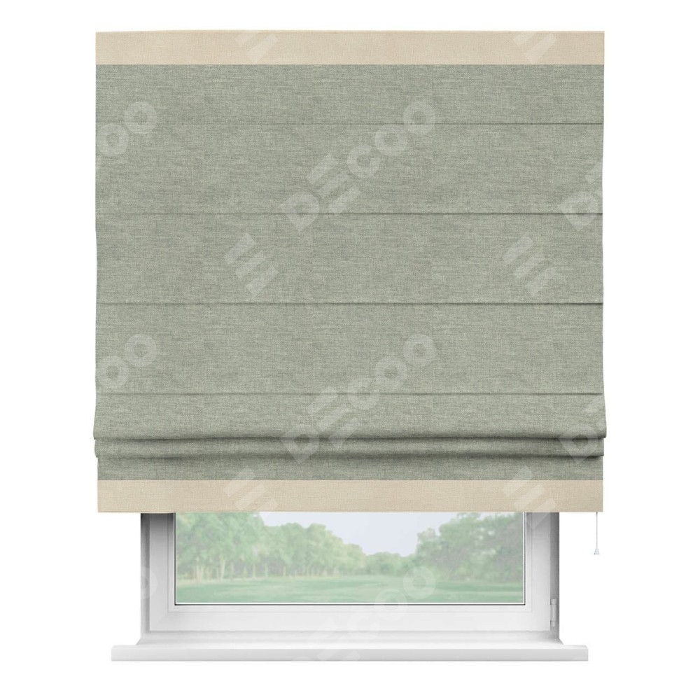 Римская штора производителя «Cortin», используется для проёма, пошита из ткани лён кашемир серый new, артикул 21618. Отделка шторы кантом «Горизонт», ткань для канта используется из льна разной расцветки на выбор. Имеет универсальный механизм и подходит для монтажа: на потолок, на стену и в нишу.