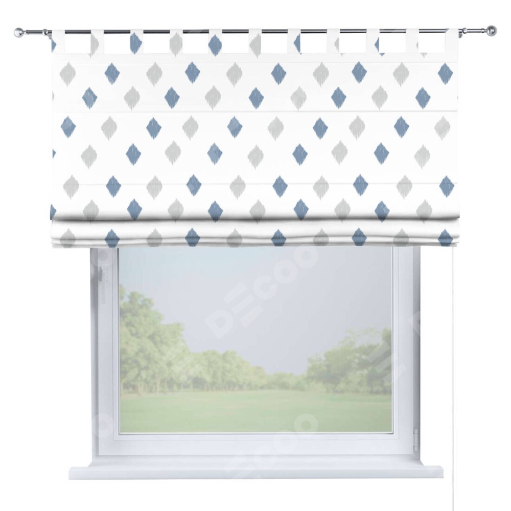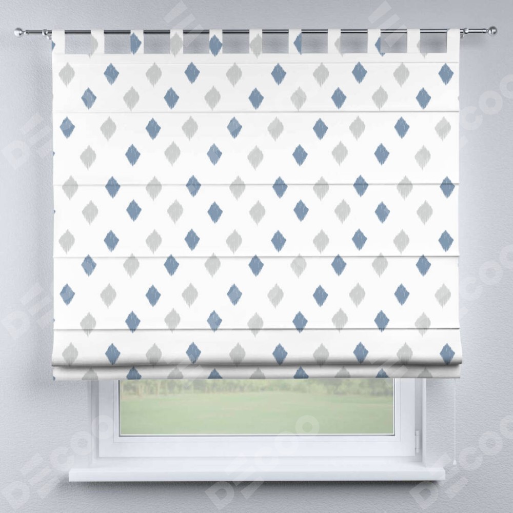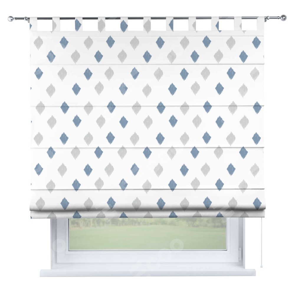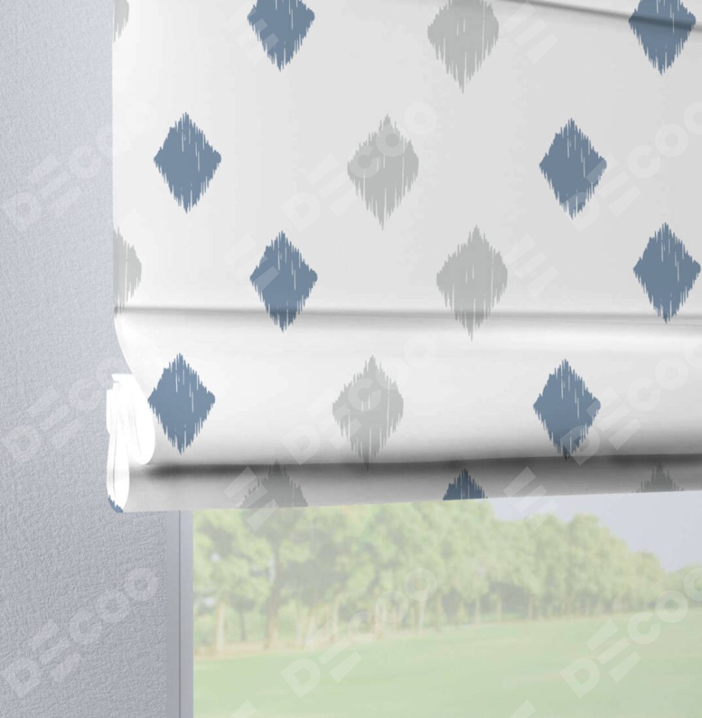 Римская штора производителя «Cortin», используется для проёма, пошита из ткани блэкаут с нанесением сублимационной печати «Икат ромбики». Данная модель пошита на петлях, комплектуется на выбор круглым карнизом и подходит для монтажа на стену. Римская штора на петлях имеет простую систему регулировки высоты, отличительным преимуществом данной модели является простой способ монтажа. Достаточно повесить ее на трубу и штора готова!