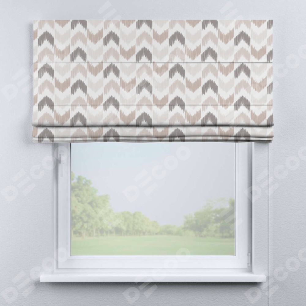 Классическая римская штора производителя «Cortin», пошита из ткани блэкаут с нанесением сублимационной печати «Икат стрелки». Имеет универсальный механизм и подходит для монтажа: на потолок, на стену и в нишу.