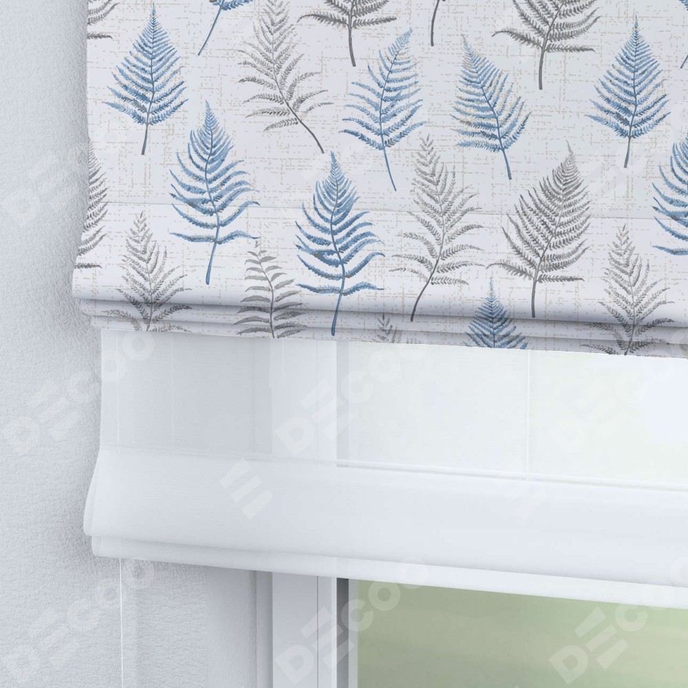 Двойная римская штора «День-ночь» от производителя Cortin предназначена для использования в проёмах. Эта штора уникальна тем, что состоит из двух полотен. На лицевой стороне находится блэкаут с нанесением сублимационной печати «Королевский папоротник», обеспечивающий эффективное затемнение. В комплект также входит вторая ткань — легкий белый тюль (артикул: V-01), который добавляет изящества и легкости оформлению окна. Кроме того, доступны и другие разновидности ткани тюль, выбор которых доступен по ссылке .
