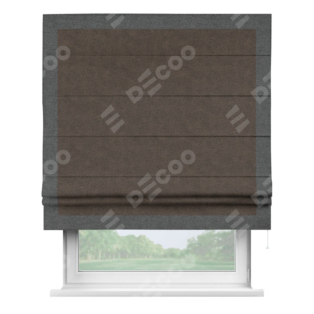 Римская штора производителя «Cortin», используется для проёма, пошита из ткани твид блэкаут тёмно-коричневый, артикул 90933. Отделка шторы кантом «Чесс», ткань для канта используется из твида разной расцветки на выбор. Имеет универсальный механизм и подходит для монтажа: на потолок, на стену и в нишу.