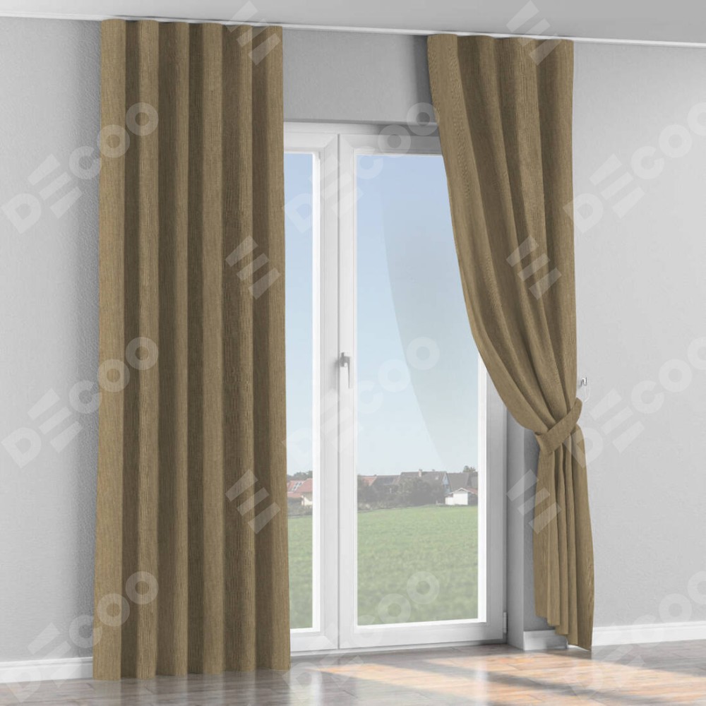 Комплект прямых штор, от производителя «Cortin», пошиты из ткани лён димаут тёмно-бежевый, артикул ткани 16261. С изнаночной стороны в верхней части штор пристрачивается шторная лента с декоративными складками «Волна». Для создания элегантных складок прямые шторы шьются по стандарту с коэффициентом 1:2 (на 100 см. ширины проёма 200 см. ширины ткани).
