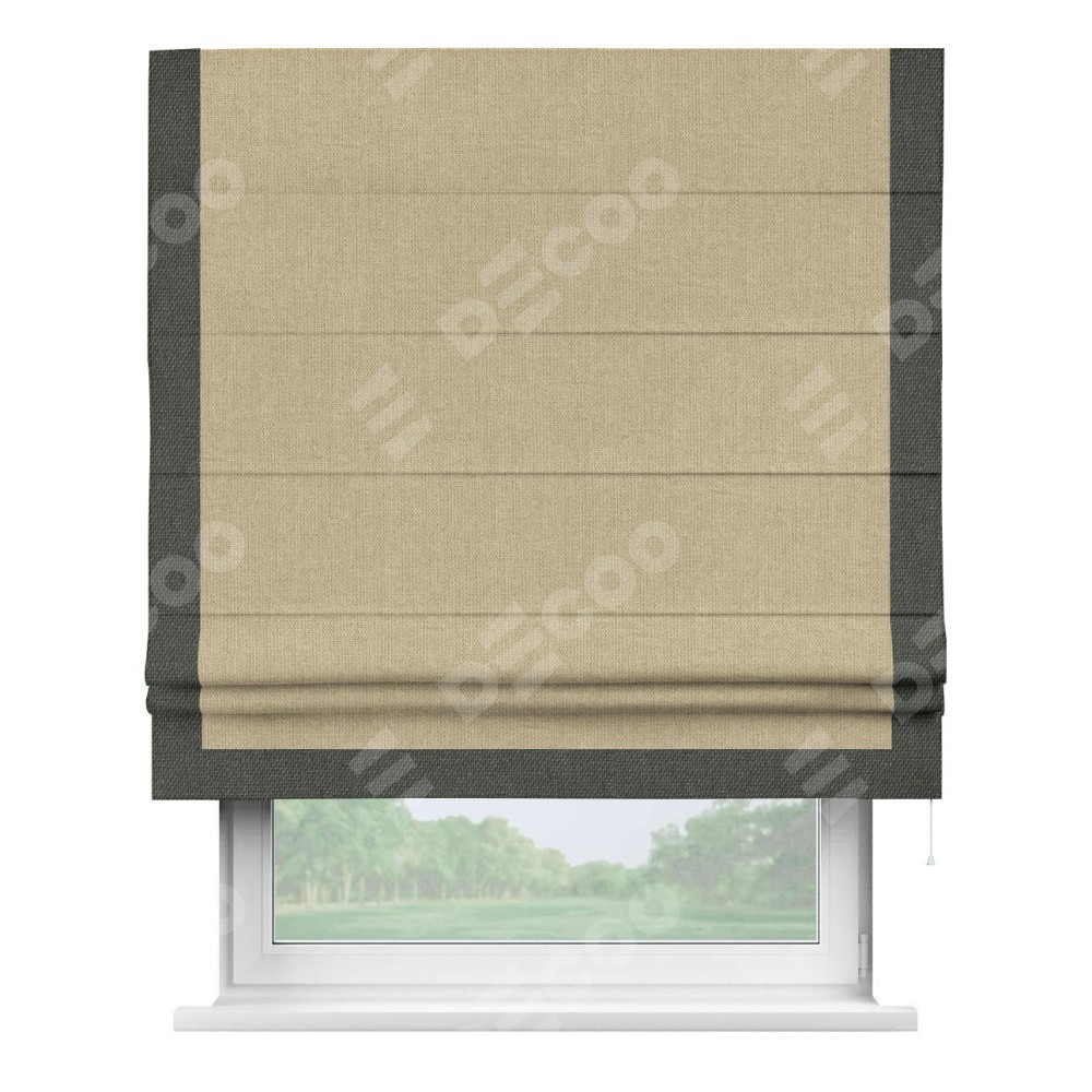 Римская штора с отделкой кантом «Виктория», пошита из ткани лён димаут песочный, артикул: 16256. представляет собой элегантное решение для оконного оформления. Кант по бокам и снизу шторы добавляет изысканности и аккуратности внешнему виду, подчеркивая линии и форму шторы. Этот элемент декора не только украшает, но и выполняет практическую функцию, защищая края ткани от износа. Кант может быть выполнен в контрастном или гармонирующем цвете, что позволяет добиться различных стилевых эффектов и легко вписать штору в интерьер комнаты.
