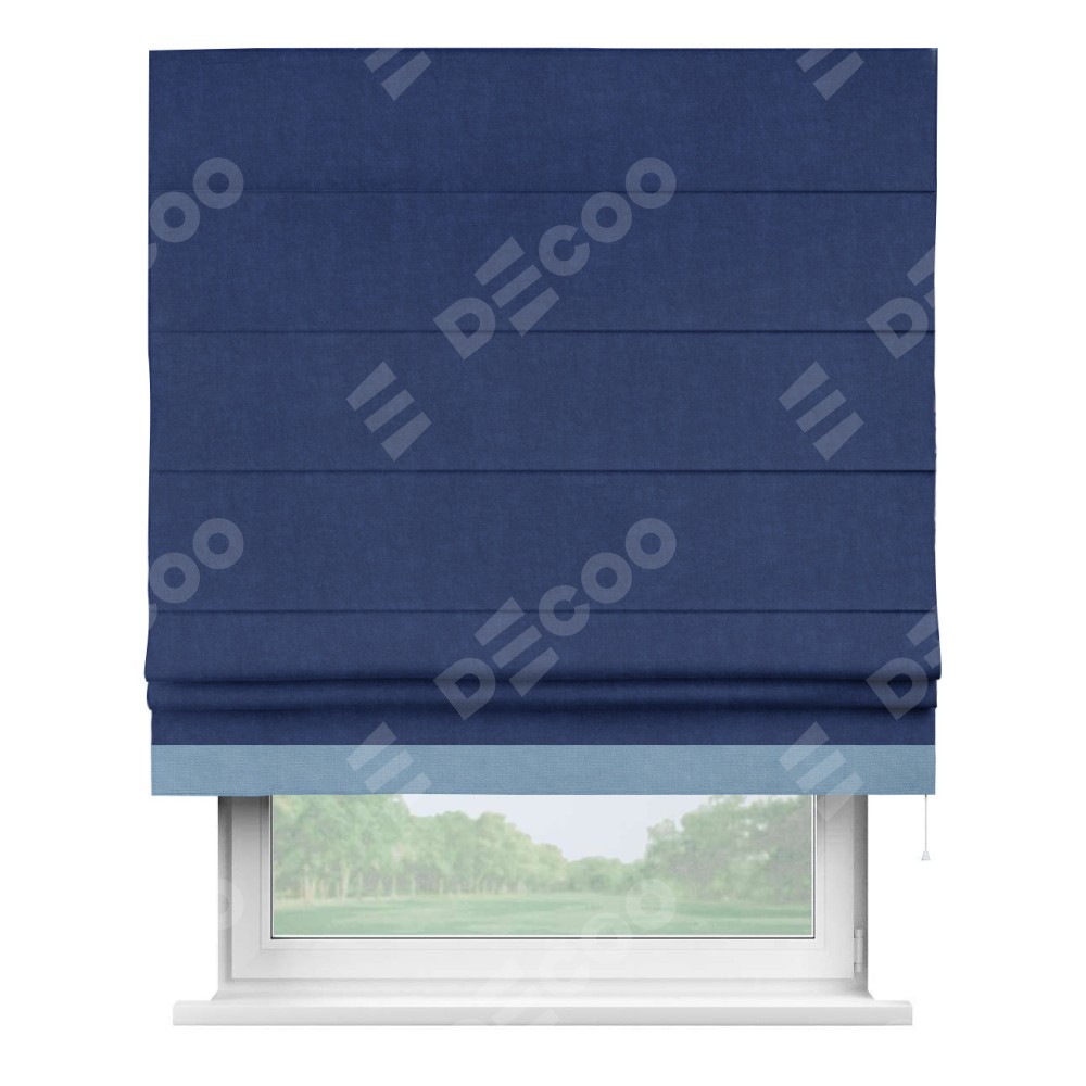 Римская штора пошита из ткани канвас синий электрик, артикул: v-355, с отделкой кантом «Джестер» выделяется своей уникальной особенностью — кантом, расположенным только снизу шторы. Этот дизайн добавляет оригинальности и игривости оконному оформлению, делая акцент на нижней части шторы и создавая интересный визуальный эффект. Отделка кантом на нижнем крае не только служит эстетической функции, но и способствует увеличению прочности и износостойкости ткани в этом месте.