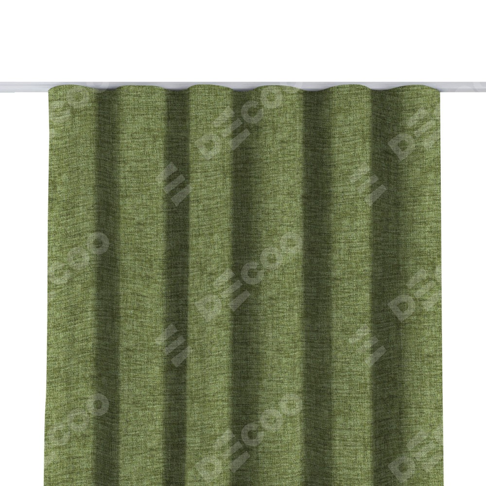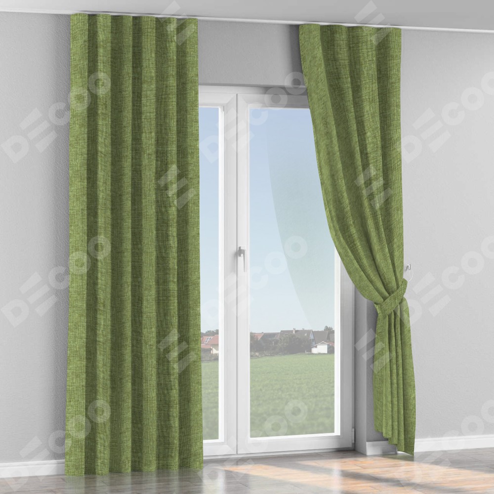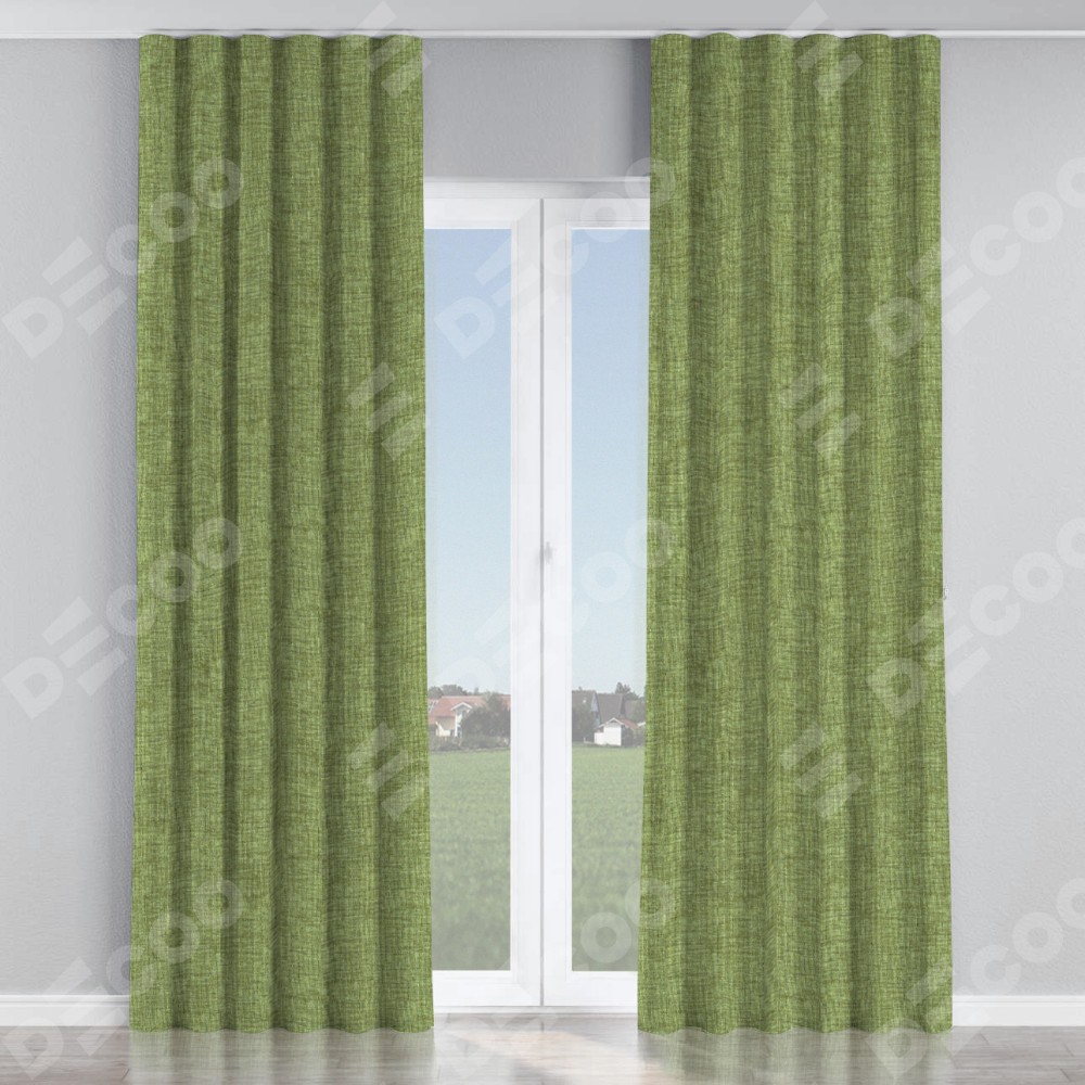 Комплект прямых штор, от производителя «Cortin», пошиты из ткани рогожка димаут травяной, артикул ткани 91021. С изнаночной стороны в верхней части штор пристрачивается шторная лента с декоративными складками «Волна». Для создания элегантных складок прямые шторы шьются по стандарту с коэффициентом 1:2 (на 100 см. ширины проёма 200 см. ширины ткани).