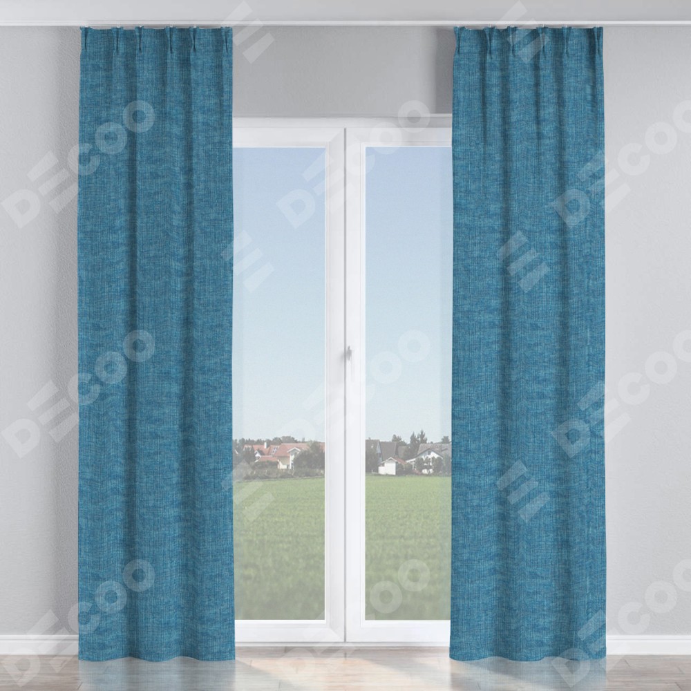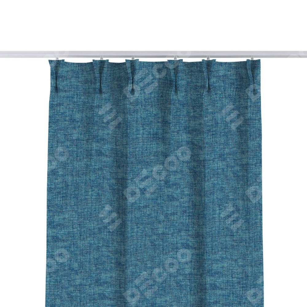 Комплект прямых штор, от производителя «Cortin», пошиты из ткани рогожка димаут лазурно-синий, артикул ткани 91024. С изнаночной стороны в верхней части штор пристрачивается шторная лента с декоративными складками «Кустик». Для создания элегантных складок прямые шторы шьются по стандарту с коэффициентом 1:2 (на 100 см. ширины проёма 200 см. ширины ткани).