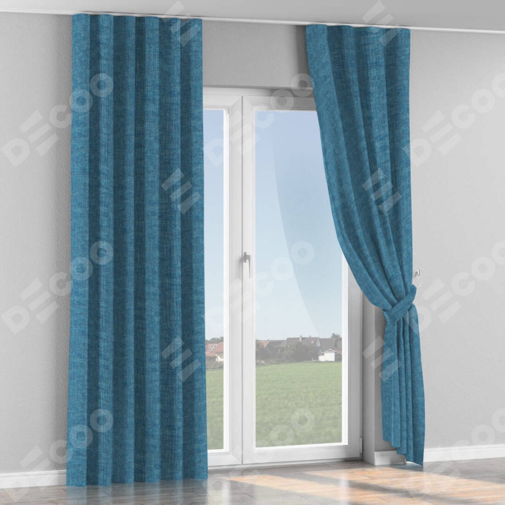 Комплект прямых штор, от производителя «Cortin», пошиты из ткани рогожка димаут лазурно-синий, артикул ткани 91024. С изнаночной стороны в верхней части штор пристрачивается шторная лента с декоративными складками «Волна». Для создания элегантных складок прямые шторы шьются по стандарту с коэффициентом 1:2 (на 100 см. ширины проёма 200 см. ширины ткани).
