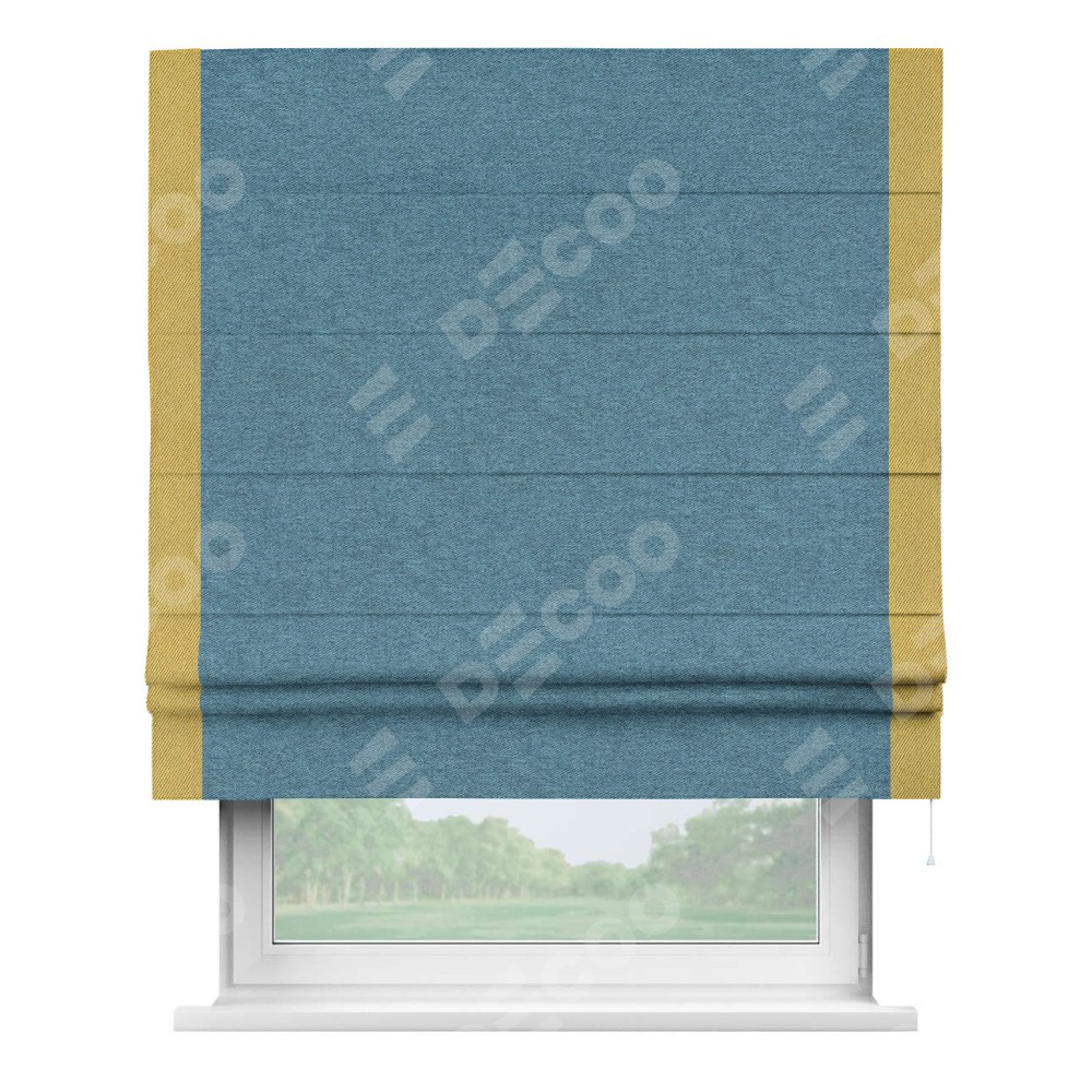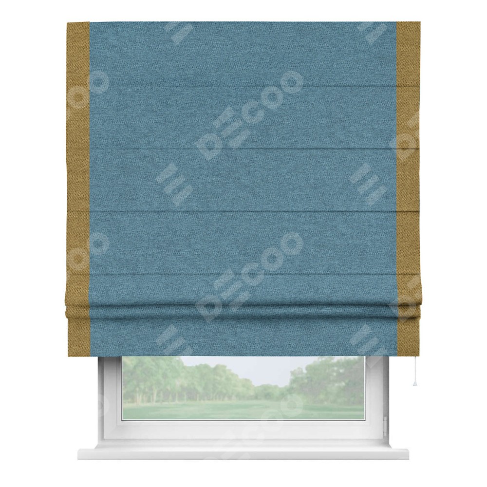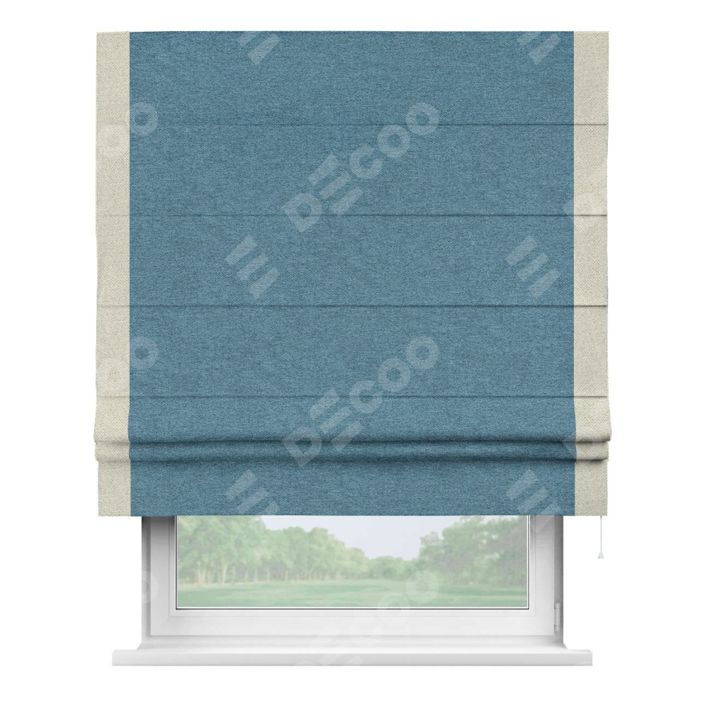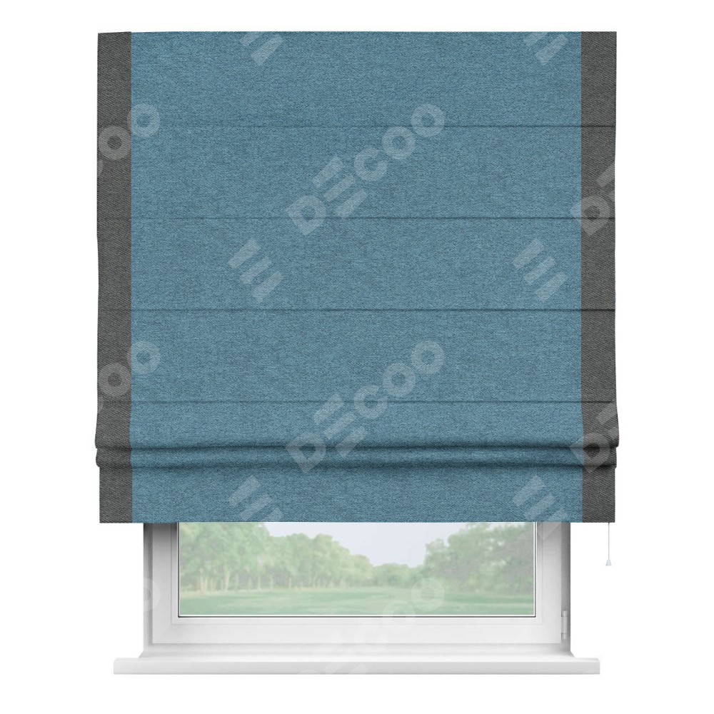Римская штора пошита из ткани твид блэкаут светло-синий, артикул: 90935, с отделкой кантом «Стрим Дуо» выделяется наличием кантов по обоим бокам шторы, слева и справа. Этот дизайн придает шторе аккуратный и завершенный вид, акцентируя вертикальные линии и визуально вытягивая окно в высоту. Отделка кантом по бокам не только украшает штору, но и служит практической функцией, укрепляя края и продлевая срок службы изделия.