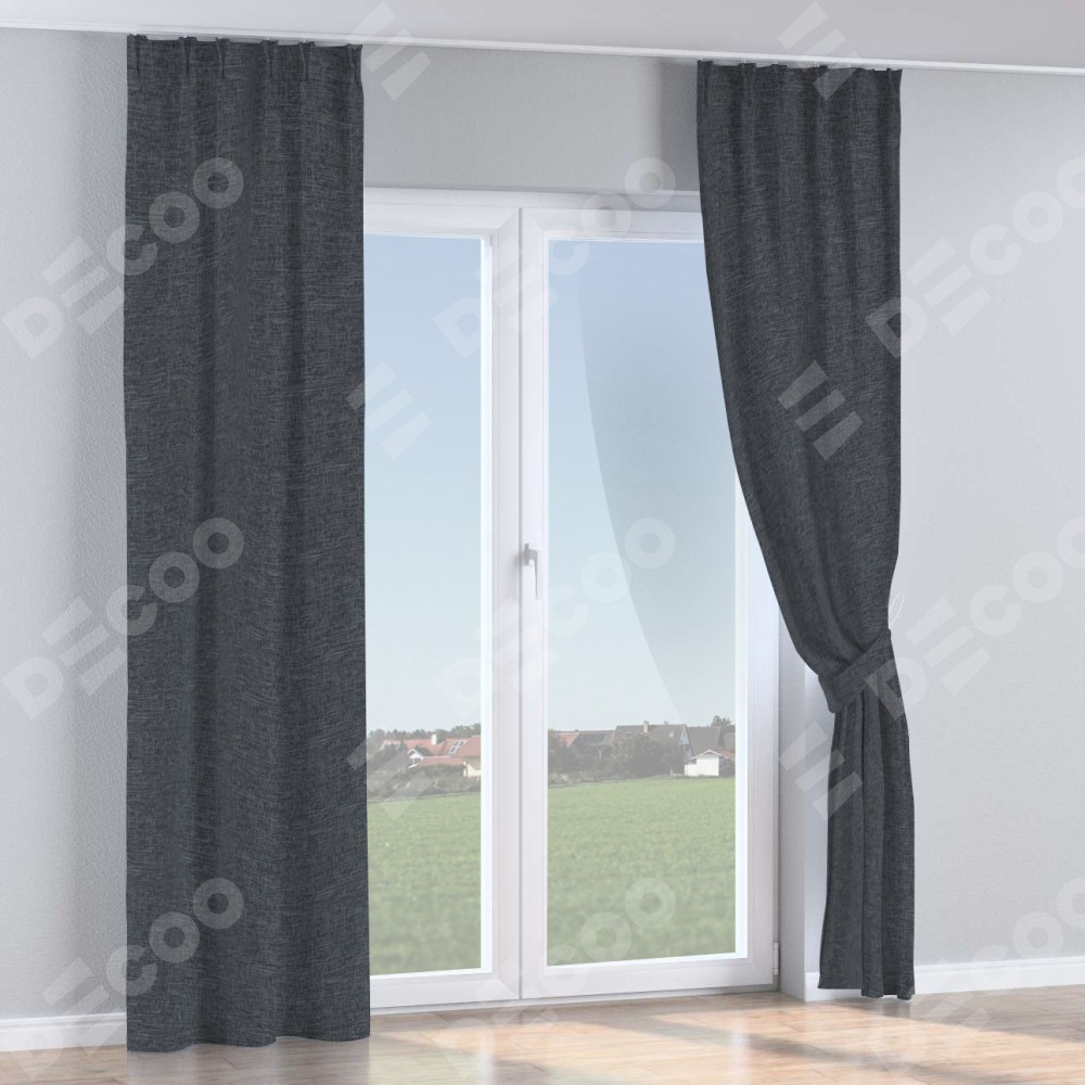 Комплект прямых штор, от производителя «Cortin», пошиты из ткани рогожка димаут графит, артикул ткани 90950. С изнаночной стороны в верхней части штор пристрачивается шторная лента с декоративными складками «Кустик». Для создания элегантных складок прямые шторы шьются по стандарту с коэффициентом 1:2 (на 100 см. ширины проёма 200 см. ширины ткани).