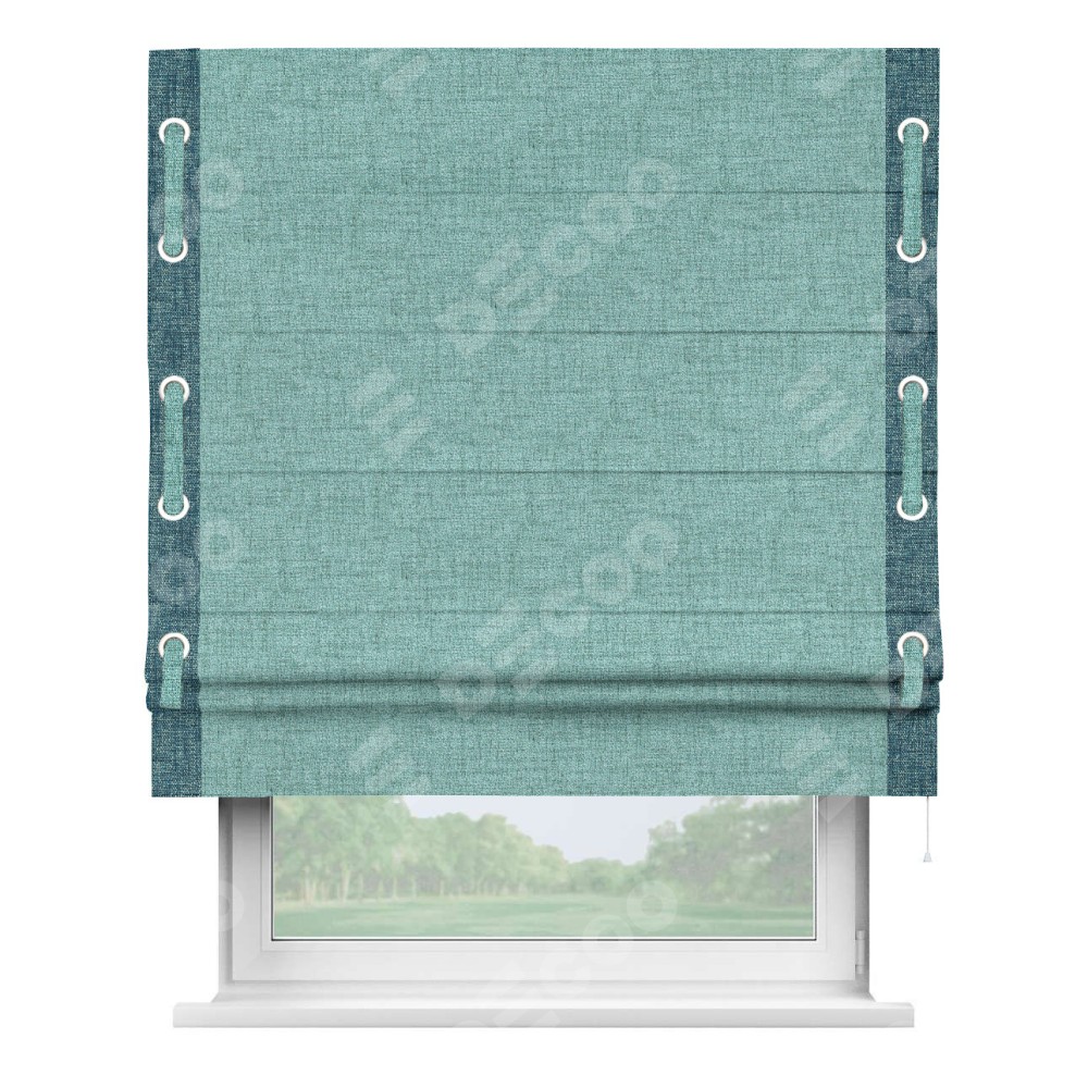 Римская штора «Кортин» для проёма, рогожка димаут аквамариновый крайола, с кантом Стрим Дуо (люверсы с пояском)