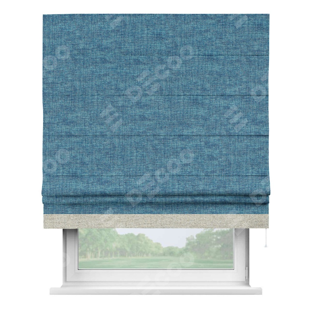 Римская штора пошита из ткани рогожка димаут лазурно-синий, артикул: 91024, с отделкой кантом «Джестер» выделяется своей уникальной особенностью — кантом, расположенным только снизу шторы. Этот дизайн добавляет оригинальности и игривости оконному оформлению, делая акцент на нижней части шторы и создавая интересный визуальный эффект. Отделка кантом на нижнем крае не только служит эстетической функции, но и способствует увеличению прочности и износостойкости ткани в этом месте.