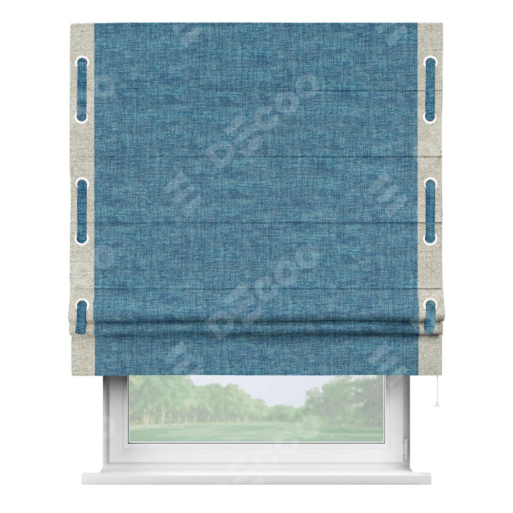 Римская штора «Кортин» для проёма, рогожка димаут лазурно-синий, с кантом Стрим Дуо (люверсы с пояском)