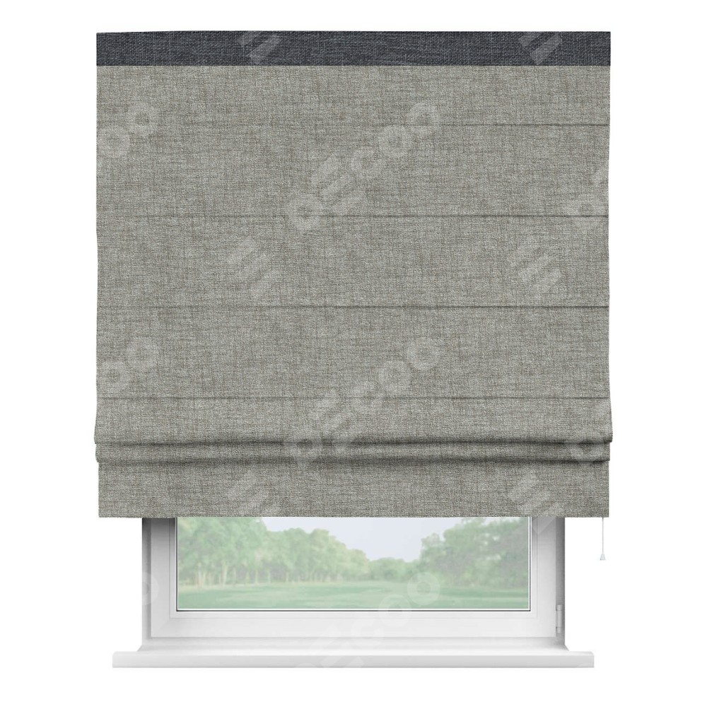 Римская штора пошита из ткани рогожка димаут серый дуб, артикул: 91028, с отделкой кантом «Кинг» отличается своей необычной особенностью: кант располагается исключительно сверху шторы. Такой дизайн делает акцент на верхней части окна, визуально поднимая потолок и придавая интерьеру более возвышенный и изысканный вид. Отделка кантом на верхней кромке не только украшает штору, но и может служить дополнительной защитой от износа в месте наибольшего контакта с механизмом управления шторой.